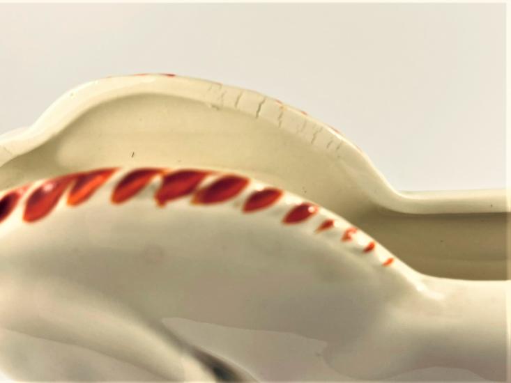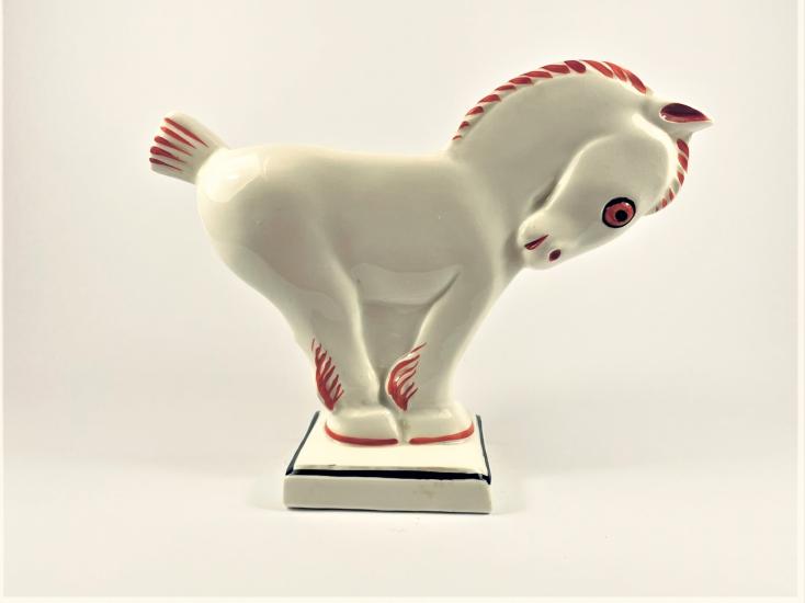 Porcelánový art deco koník o rozměrech: výška 14 cm, v nejširším bodě 18 cm, porcelán značen Goebel.