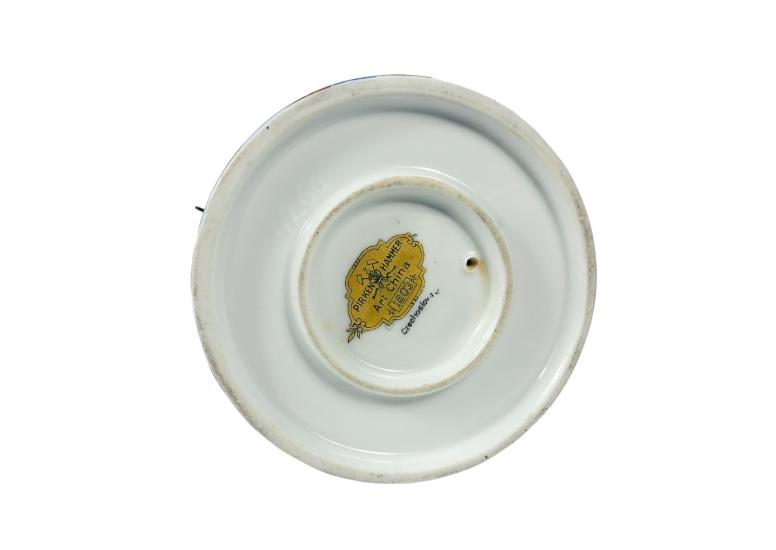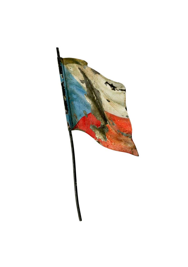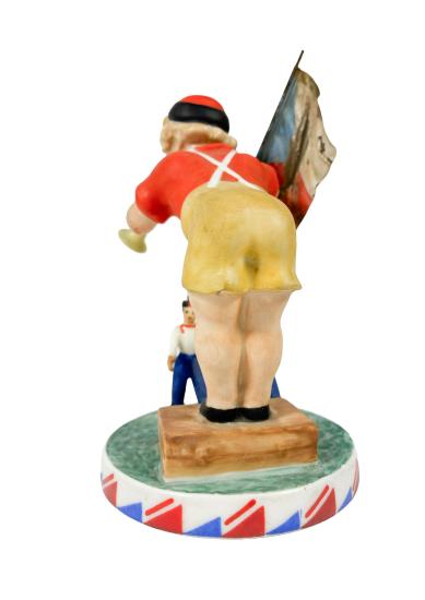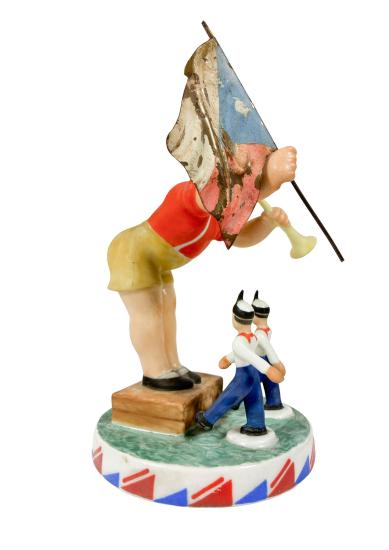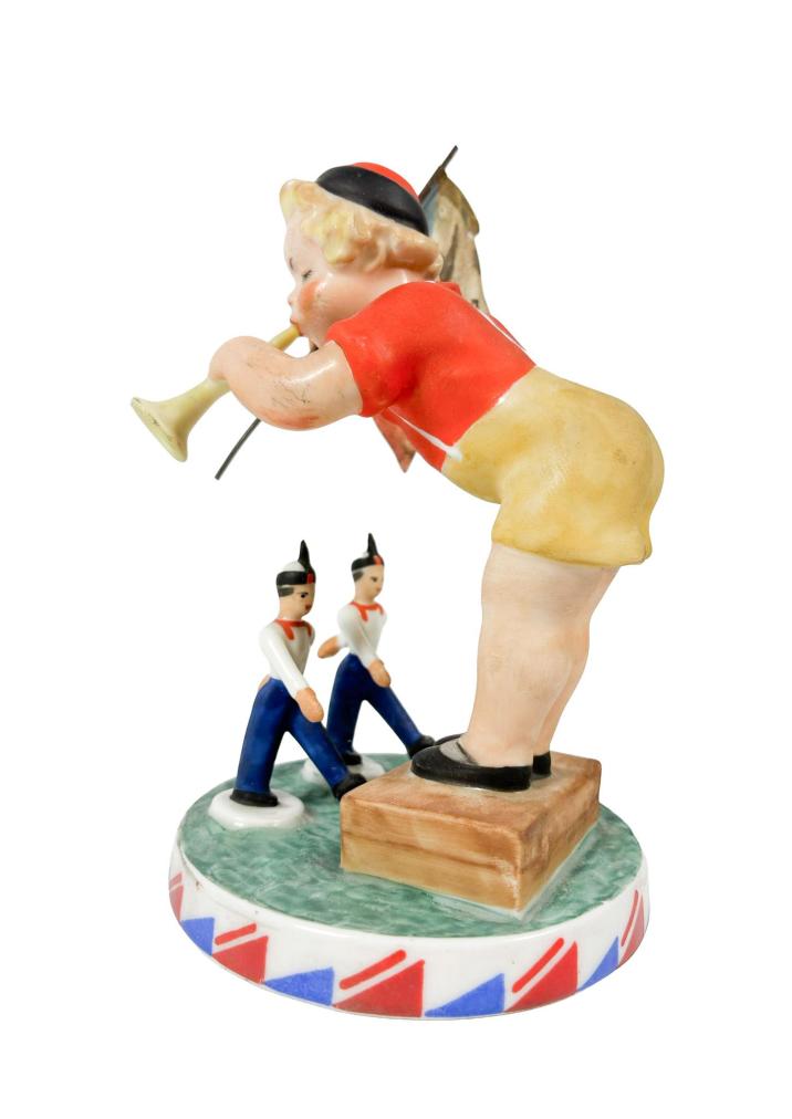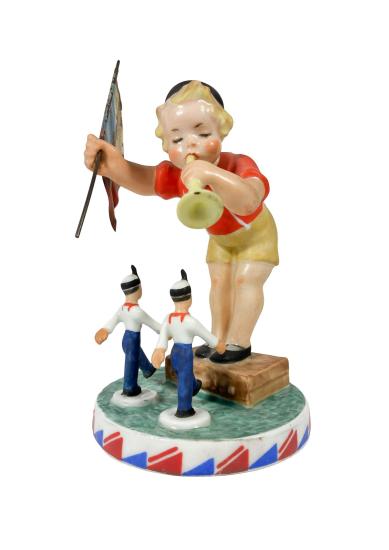 Pěkná porcelánová soška panenky, která troubí na trubku a v ruce drží naši vlajku. Pod panenkou jsou malí vojáčci. Výška 16 cm, v nejširším bodě 10 cm, podstavec 9 cm. Vlajka je z kovu, barvy na ní jsou setřené - viz foto. Soška v pěkném stavu, barva místy setřena, nepoškozeno. Značeno vespod "Pikern Hammer, Art China, 1803".