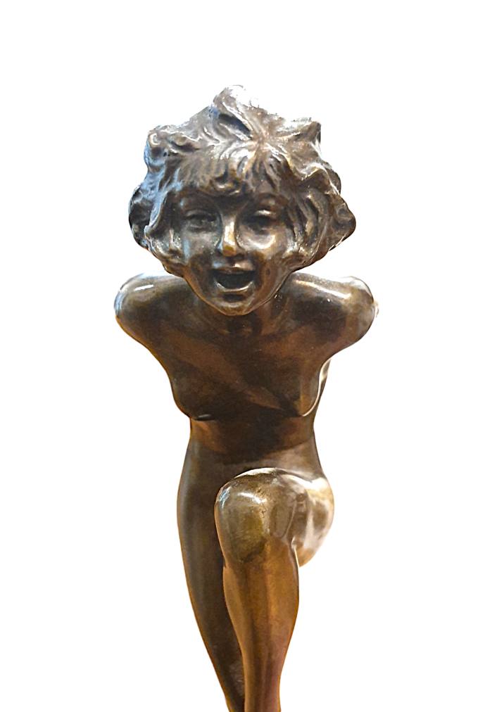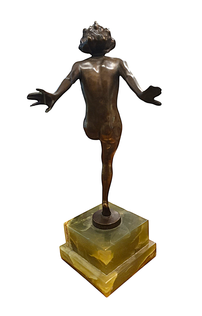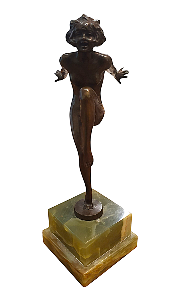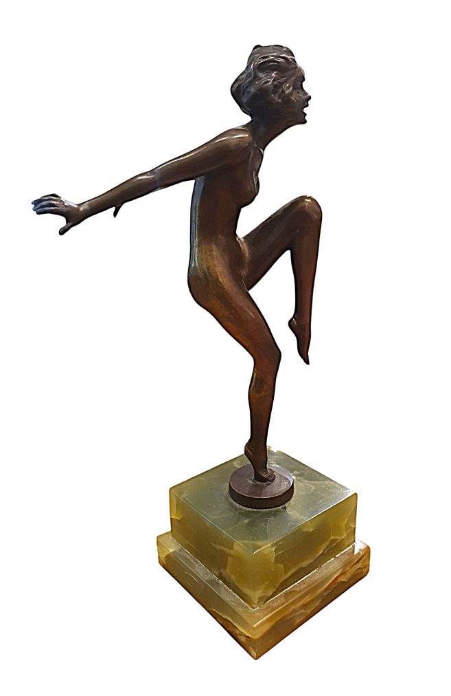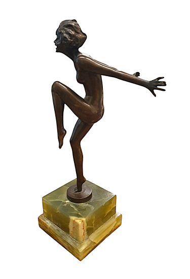 Krásná soška ženy v nakročení k tanci. Autor zdařile vytváří velmi dynamickou figuru, žena má nadšený výraz ve tváři a materiál bronzu v kombinaci s onyxovým podstavcem působí skvěle. Výška včetně podstavce 25 cm, v nejširším bodě 11 cm, podstavec 8 x 8 x 5 cm. Signatura "Lorenzi".
