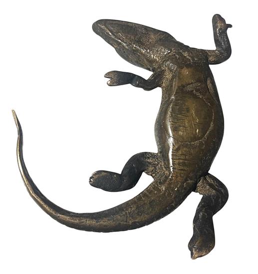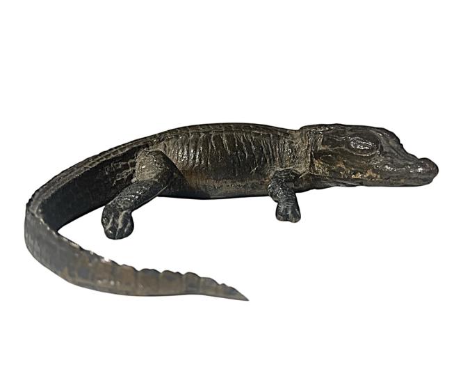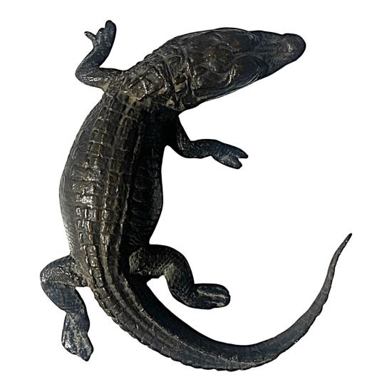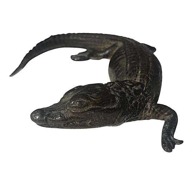 Realistická plastika malého kajmana odlitá z bronzu. Na délku měří 13,5 cm, v nejširším bodě měří 8,5 cm. Tloušťka/hloubka je 3,5 cm. Bez poškození, neznačeno.