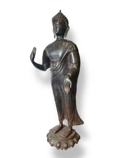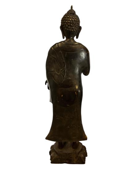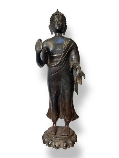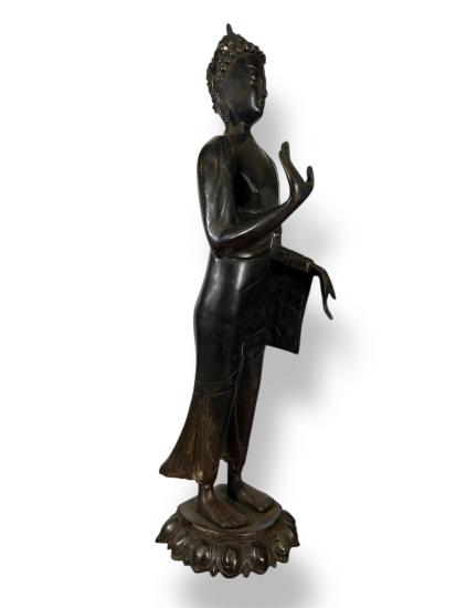 Bronzová socha Buddhy na zdobném podstavci. Výška 55 cm, v nejširším bodě 19 cm. Neznačeno.