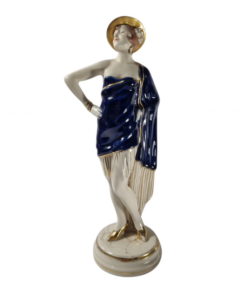 Porcelánová soška pózující ženy v klobouku a modrém šálu se zlacenými detaily. Výška sošky je 36 cm, průměr podstavce je 11 cm. Zlatá barva je místy lehce setřená. Značeno zespod Royal dux Bohemia.