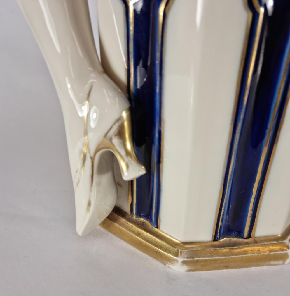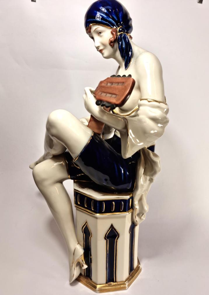 Půvabná porcelánová soška sedící dívky ve stylu Art Deco. Soška působí velmi živě, půvabně a ladně. Krásný detail tvoří zlaté lemování, linka decentně zdobí a rámuje oděv dívky, stejně jako podstavec, na kterém sedí. Výraznou roli zde hraje i modrá barva, tyto barevné plochy nádherně září a nechávají vyznít hebký a lesklý povrch porcelánové sošky. Výška 50 cm, šířka 30 cm. Značeno "Royal Dux Bohemia". Zlatá barva místy setřená.