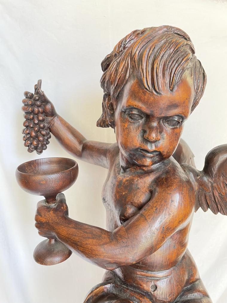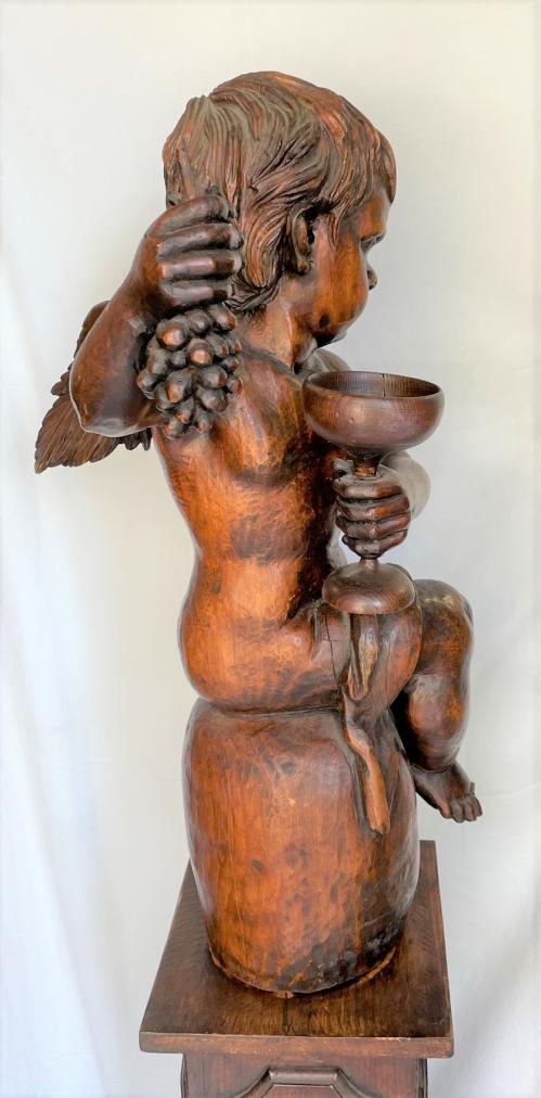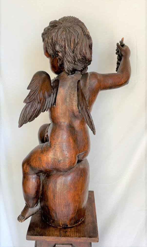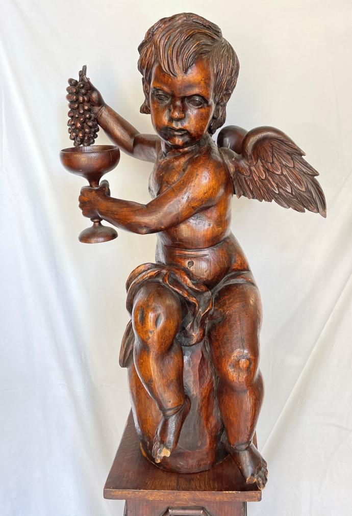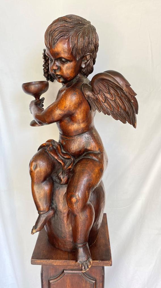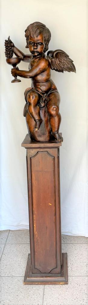Výška podstavce 88 cm, rozměr podstavce 23 x 23 cm, výška andílka 66 cm, podstavec nese známky mírného opotřebení - oděrky, andílkovi chybí oba palce u nohou a nese známky mírného opotřebení - ojedinělé oděrky