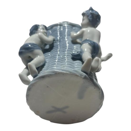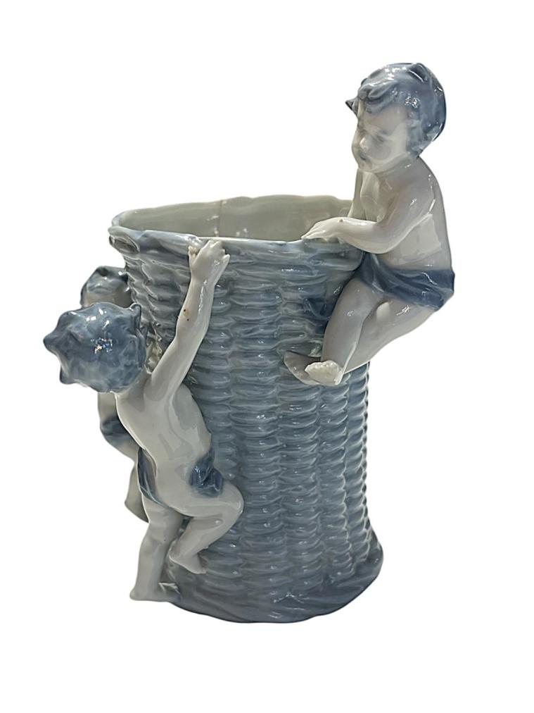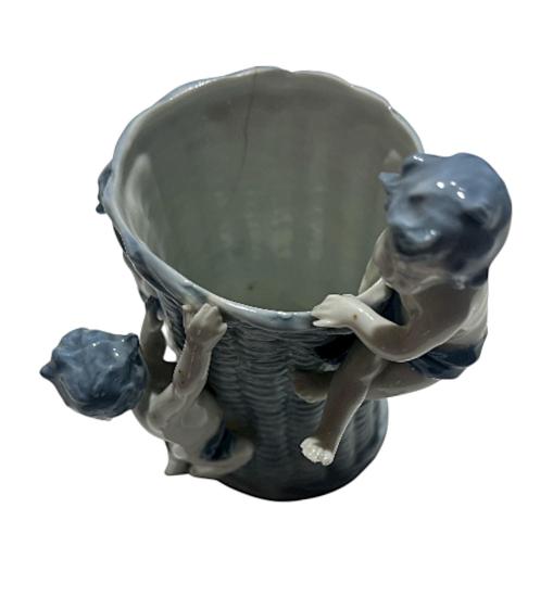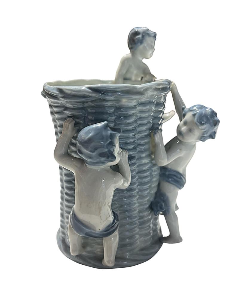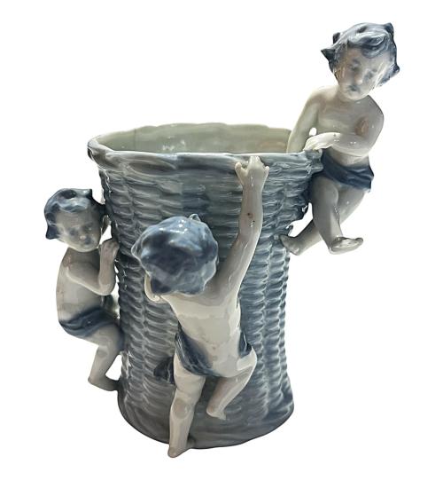 Roztomilá váza v podobě pleteného košíku s plastikami tří Putti. Modro bílý dekor. Na výšku měří 14 cm. Průměr hrdla je 7 cm, průměr podstavy také 7 cm. Od hrdla ke středu vede cca 5 cm dlouhá prasklina, jinak v dobrém stavu. Neznačeno.