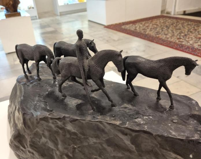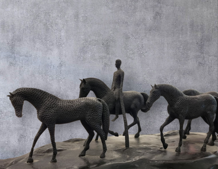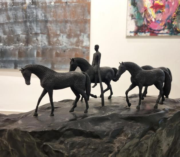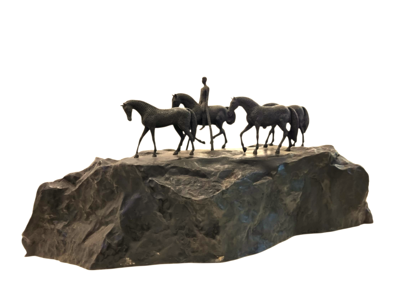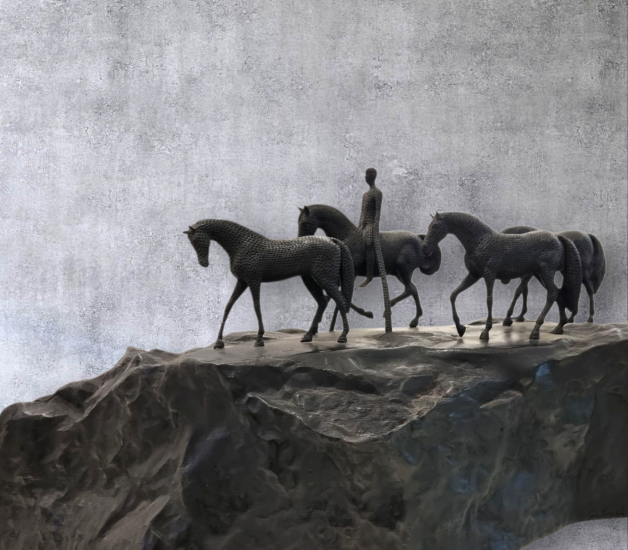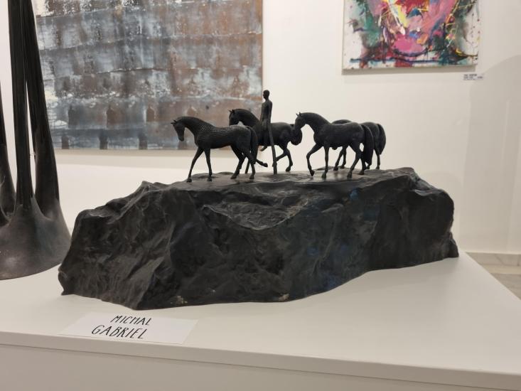 Bronzové sousoší s pracovním názvem ,,Sousoší s jezdcem,, první odlitek ze čtyř. Výška 31 cm, délka 69 cm, v nejširším bodě 20 cm. Signováno Gabriel.