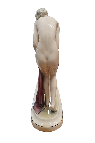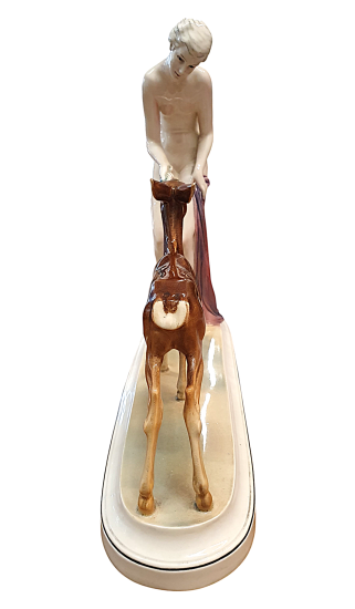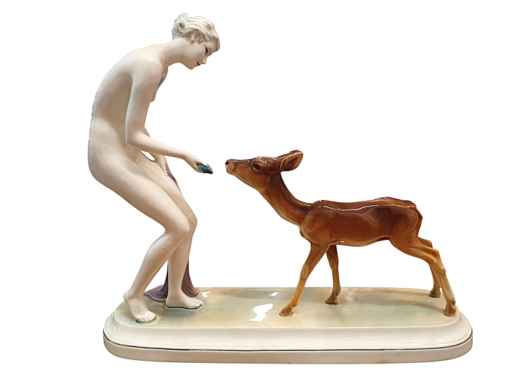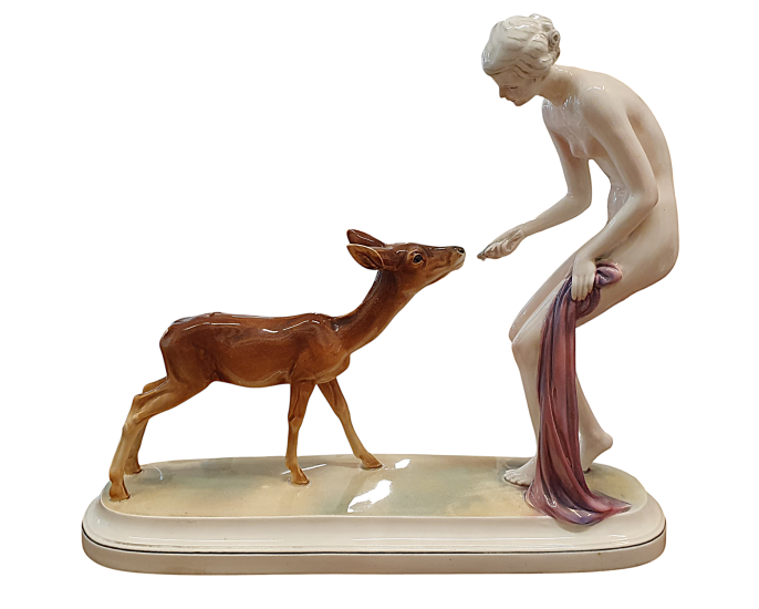 Jemná Art Deco plastika vyobrazující dívku pouze s lehkou řúžovou látkou v ruce, jak podává zelené lístky srnce. Tento poetický výjev dvou ladných stvoření pochází od společnosti Hertwig - Katzhütte, Německo. Na výšku měří 27 cm, na délku 23 cm, šířka/ hloubka je 9 cm (dle podstavce). V perfektním stavu, bez poškození. Značeno ze spodní strany dole logem Hertwig - Katzhütte.