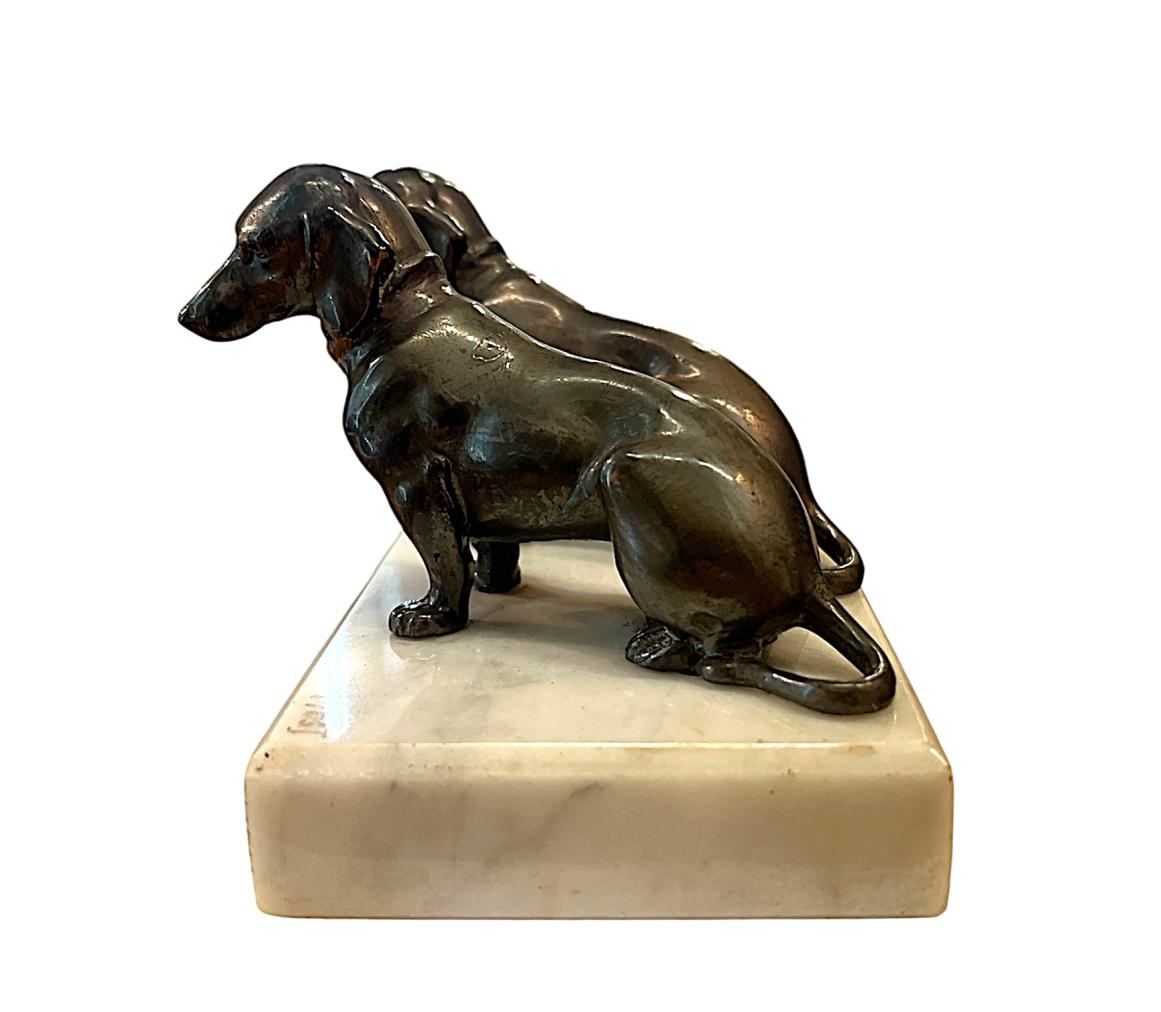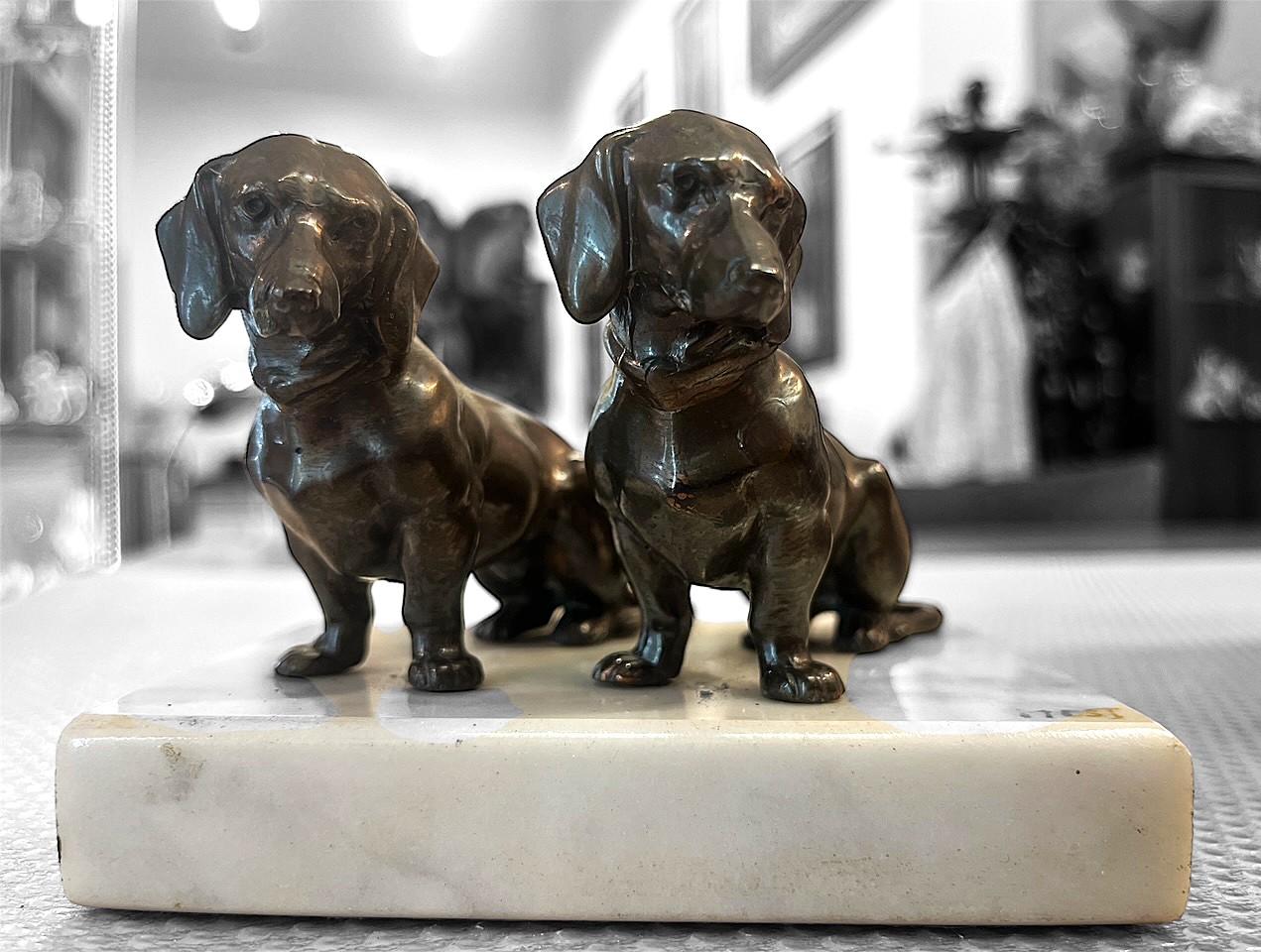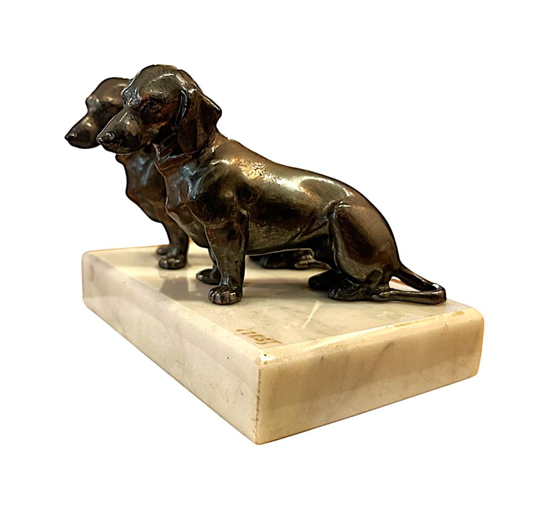 Kovové sousoší jezevčíků, sedících na mramorovém podstavci. Psíci na výšku měří 6,5 cm. Celková výška s podstavcem je 9 cm. Šířka( dle podstavce) je 12,5 cm, a hloubka 8 cm. Bez poškození. Signatura je špatně čitelný a nachází se na pravé straně podstavce v rohu. Spodní strana podstavce podlepena zelenou látkou.