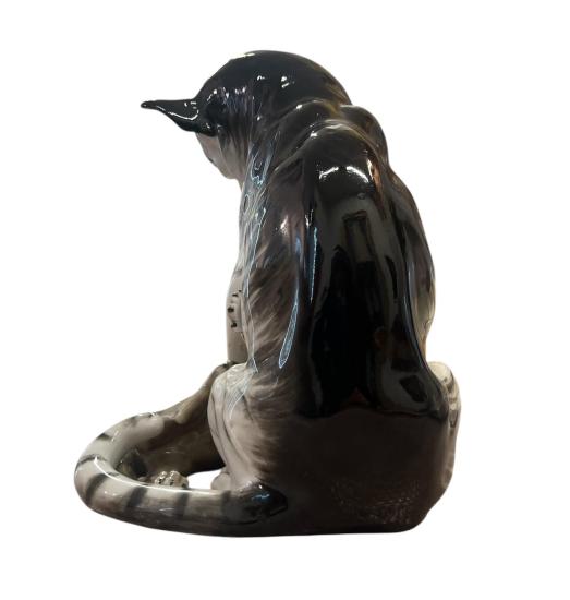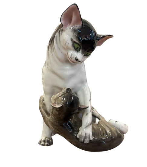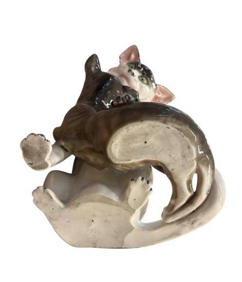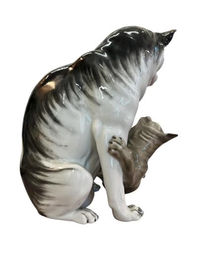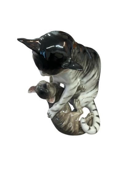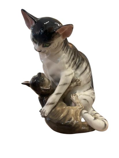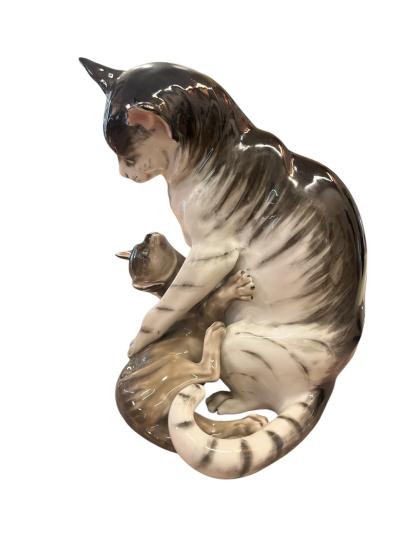 Porcelánové sousoší kočky s kotětem, zachycených při hře. Kočky mají jednoduché realistické zbarvení s výraznýma zelenýma očima. Na výšku měří 24 cm, v nejširším bodě měří 19 cm. Hloubka je cca 21 cm. V perfektním stavu, bez poškození. Značeno ze spodní strany vtlačenými číslicemi, viz foto. První polovina 20. století - Německo.