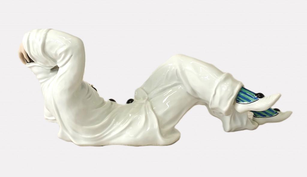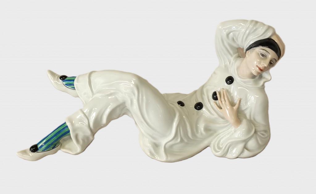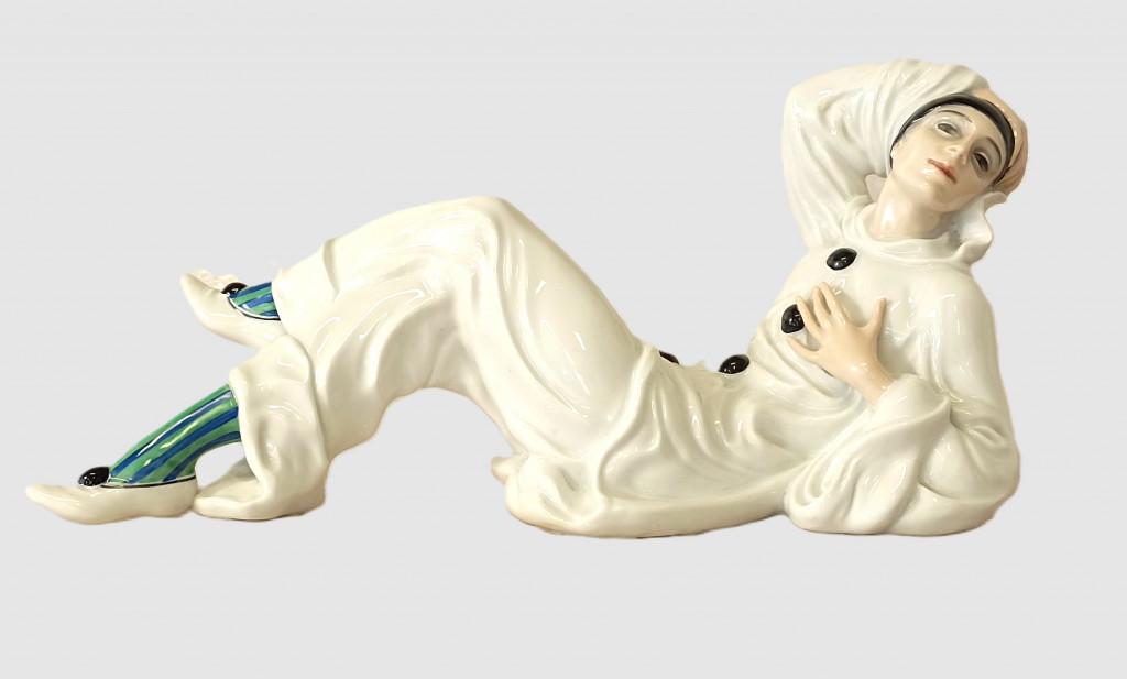 Krásná soška ležícího pierota se zkříženýma nohama a rukou přehozenou přes hlavu - art deco. Číslo modelu K549, rok 1920. Autor Constantin Holzer - Defanti, který pracoval pro Rosenthal jako sochař. Hlavním směrem autora byla tvorba soch tanečníků. Rozměr: šířka 31,5 cm x výška 13 cm x hloubka 16 cm. Značeno na spodní straně viz foto. Perfektní stav.