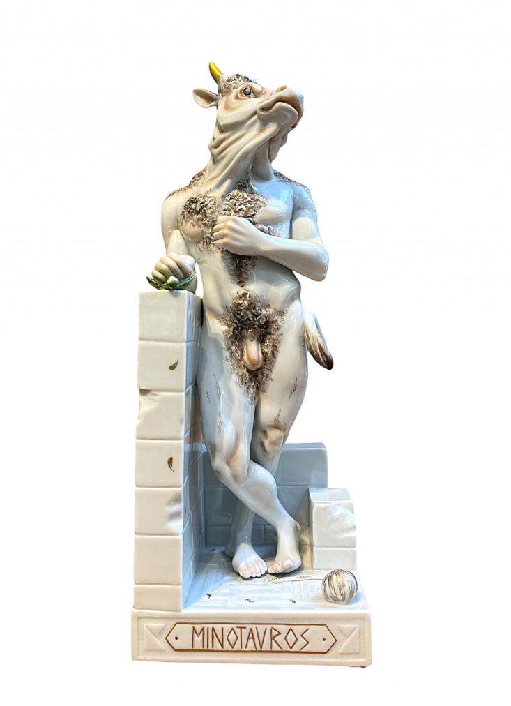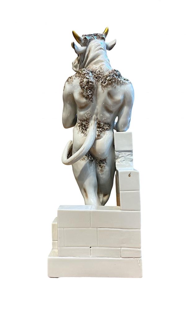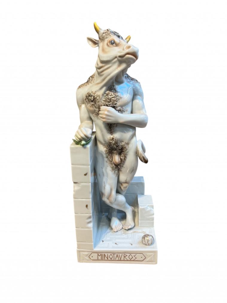 Neobvyklá porcelánová soška, jejíž námětem se stala bájná postava Minotaurus. Autor zde pracuje s hmotou těla velmi uvěřitelně a dokonale kombinuje lidské tělo s býčím. Soška zaujme detaily, jako je ptáček, kterého zrovna Minotaurus drtí pěstí či Ariadnino klubko u jeho nohou. Výška 28,5 cm, šířka 10,5 cm, značeno Rudolstadt.