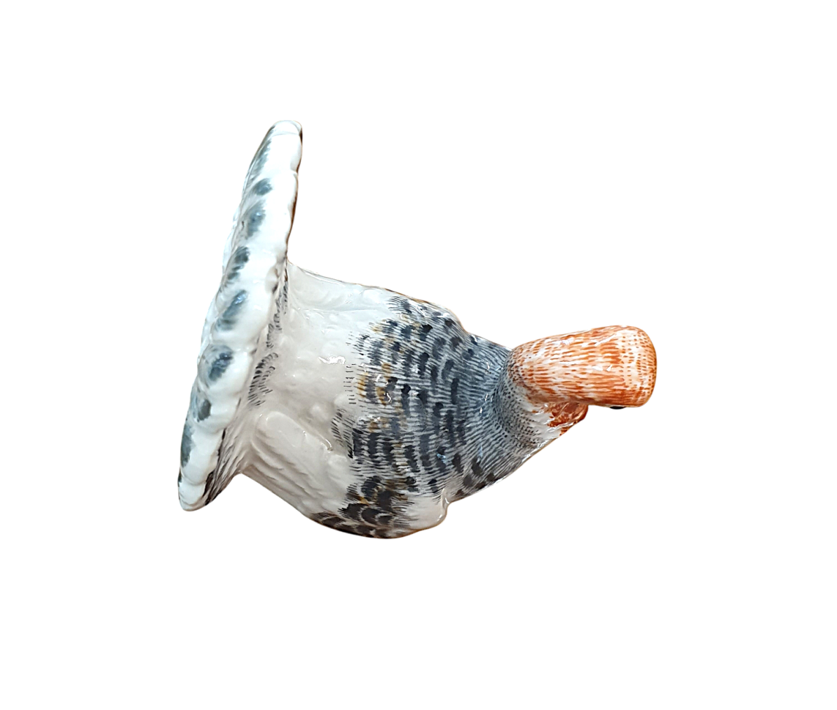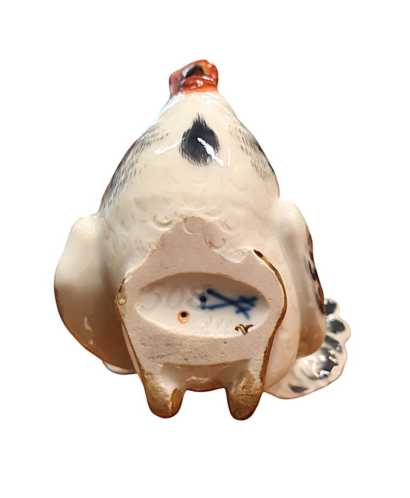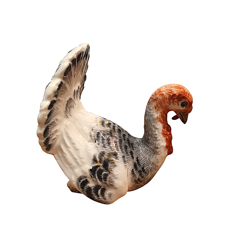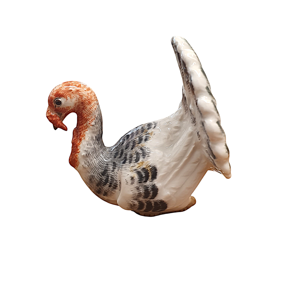 Skvělá Míšeňská porcelánová soška krocana s obrovským množstvím detailů. Na sošce vyniká drobná malba peří a zaujme i její barevnost, hlava krocana má krásný odstín červené. Výška 8,5 cm, v nejširším bodě 7 cm, hloubka 8 cm. Značeno vespod - Míšeň. Perfektní stav.