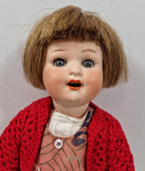 Panenka s porcelánovou hlavičkou - zrzka, značeno Heubach Koppelsdrof číslo 300. Výška 26 cm celkem. Lehké oděrky.