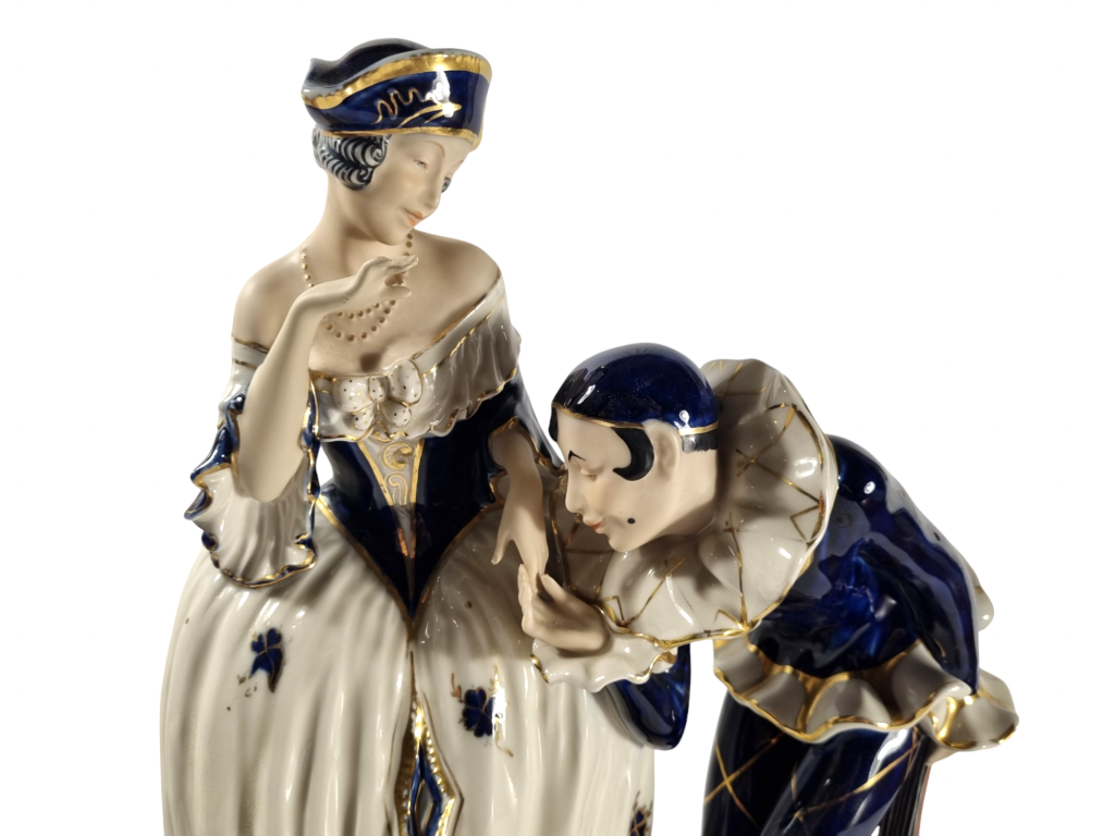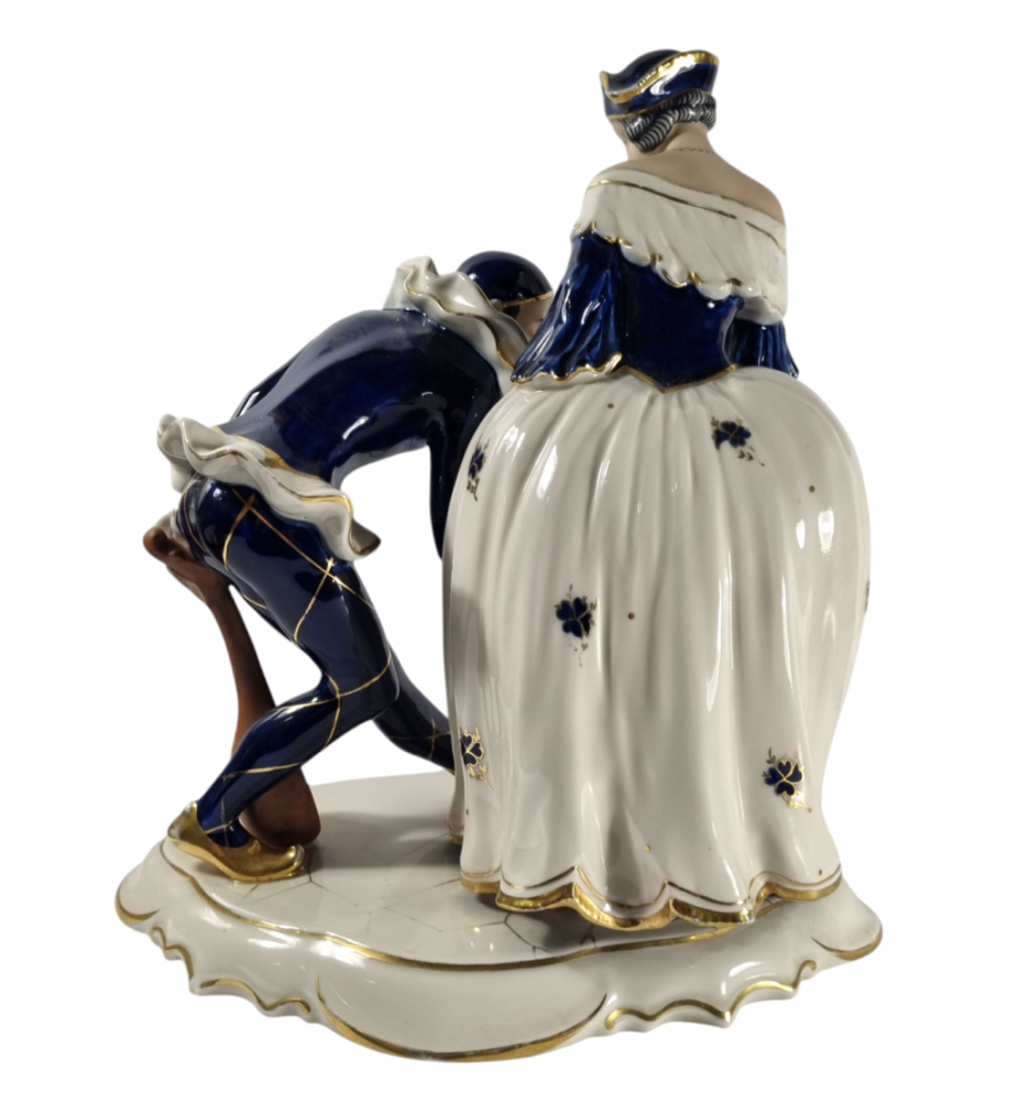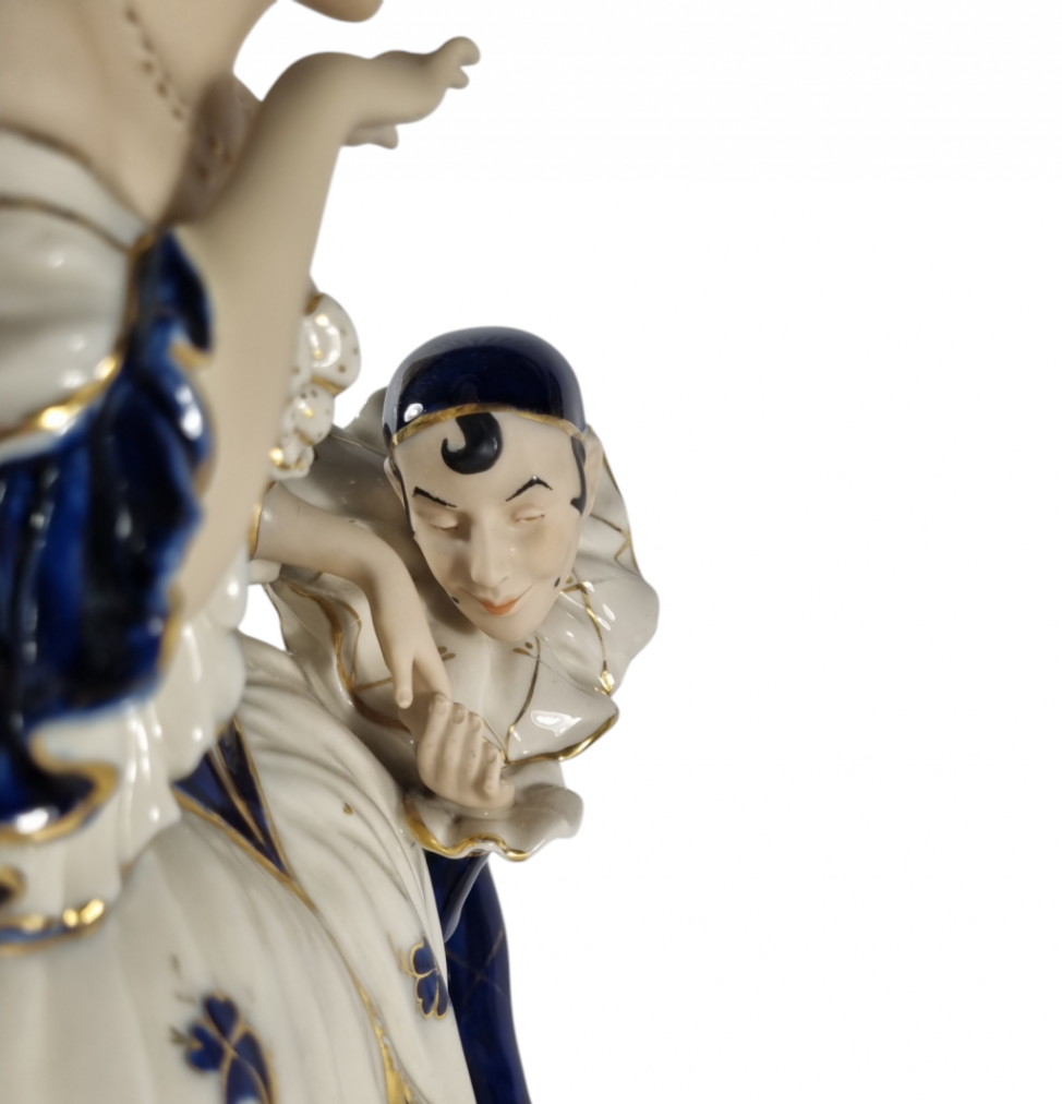 Porcelánové sousoší slavné dvojice Commedia dell´arte, Pierot a Kolombína. Kobaltová modř je doplněná zlacenými detaily. Zlatá barva je místy lehce setřena. Výška sochy v nejvyšším bodě je 40 cm, rozměry podstavce jsou 36 x 25 cm. Značeno zespod Royal dux Bohemia.
