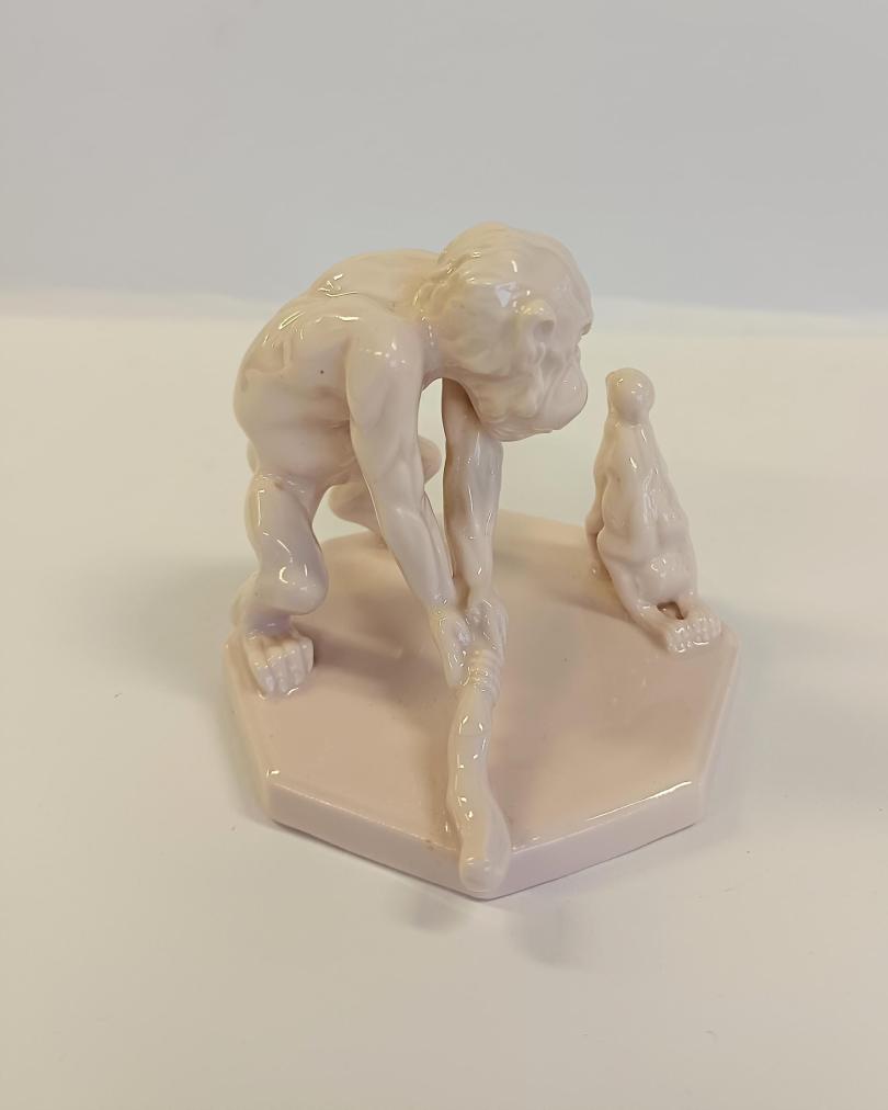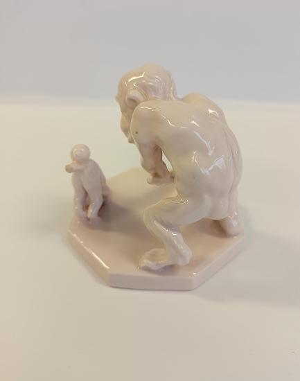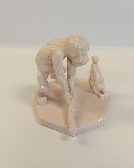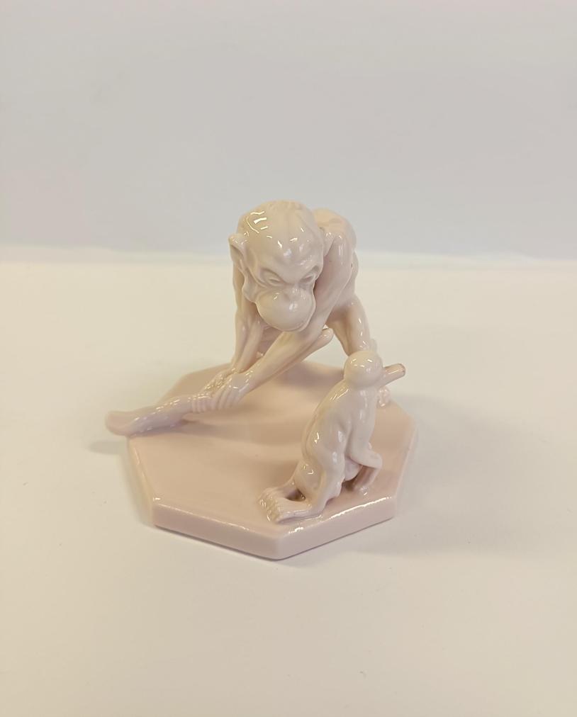 Plastika z růžového porcelánu znázorňující dvě opice, známá pod názvem ,,Golfista". Rozměry 9 x 9cm. Ze spodu značena ,,P". Není glazura na konci ocásku.