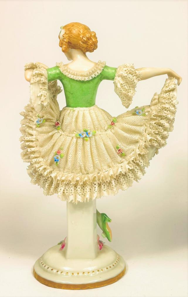 Výška 18 cm, průměr podstavy 6cm, stav viz. foto - spodní lem šatů chybí, odřená barva na hlavě, značeno viz. foto