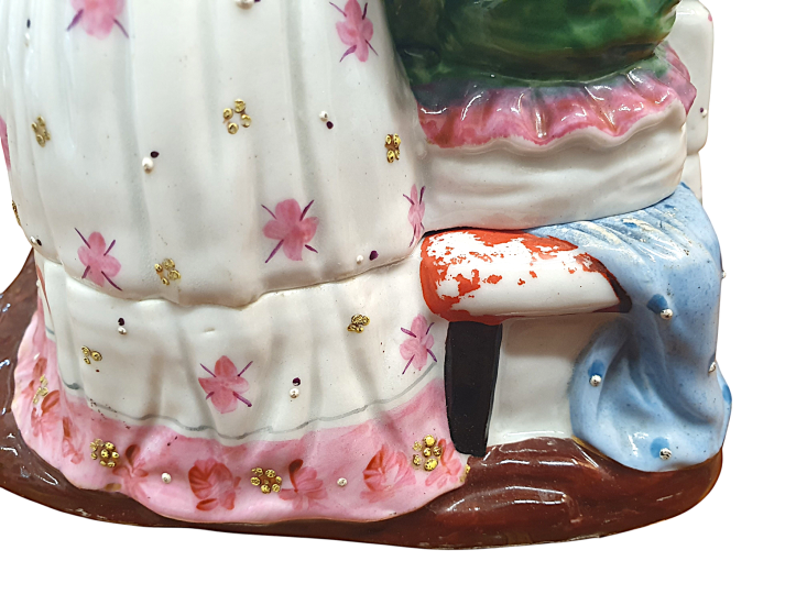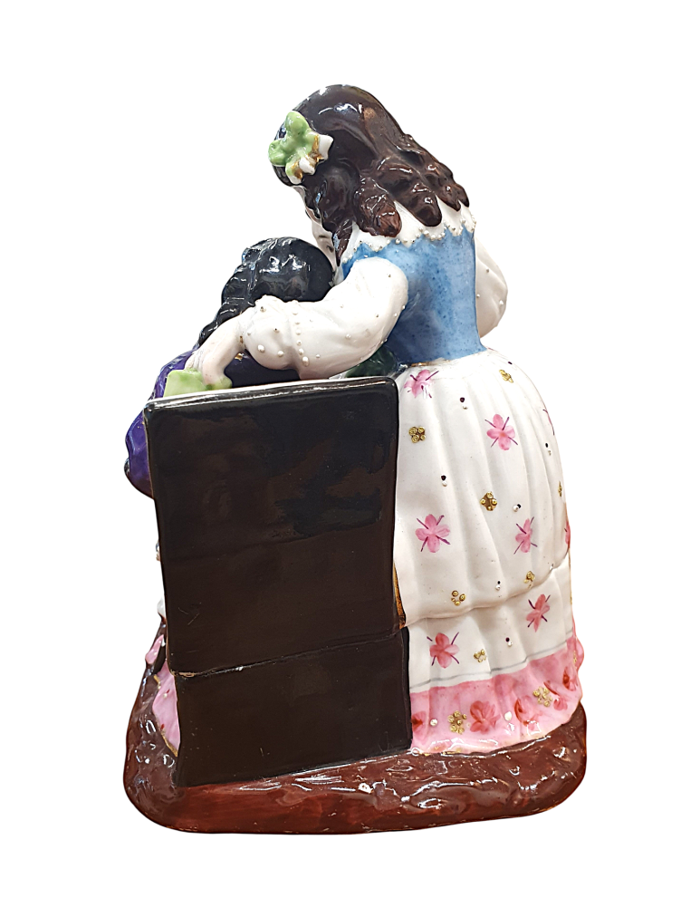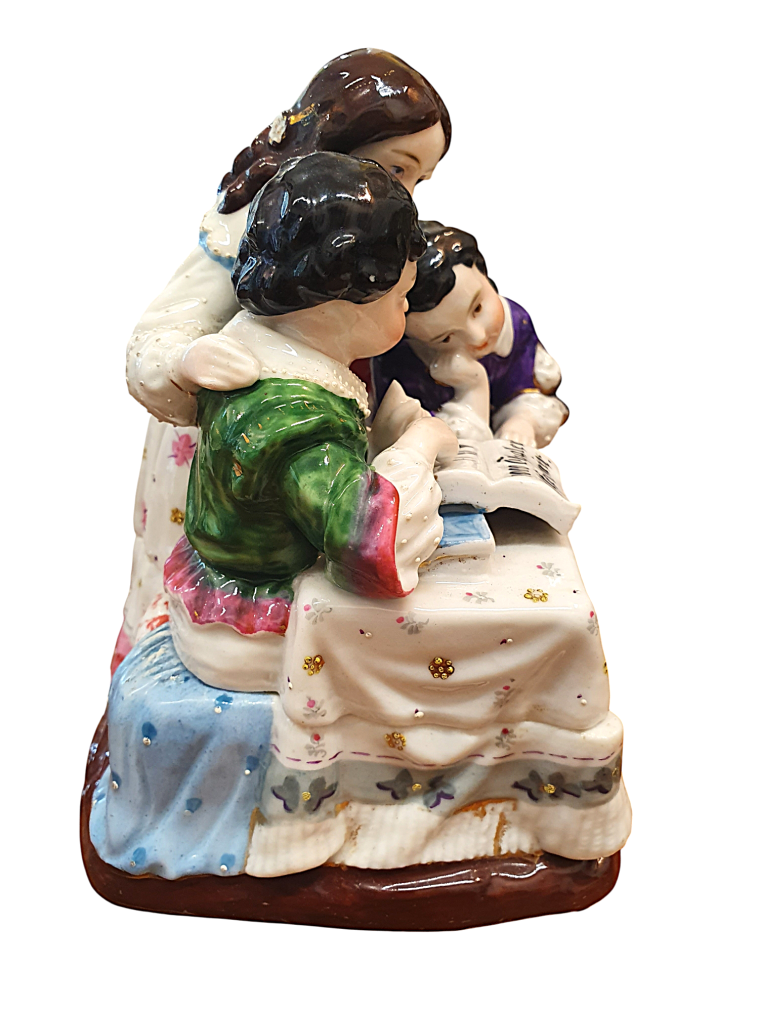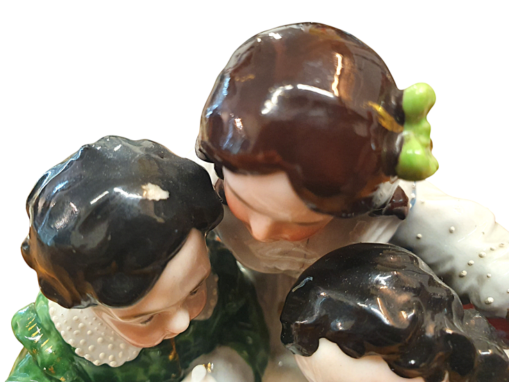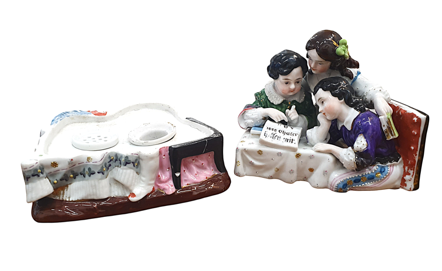 Krásná porcelánová soška, která ukrývá kalamář. Trojice děvčátek se naklání ke knize, všechny oblečené ve zdobných šatech s jemnými detaily. Výška 15 cm, v nejširším bodě 17 cm, podstava 10 x 13 cm, průměr nádobek 3 cm a 3,5 cm. Barva a zlacení místy setřené, místy jemné oťuky. Neznačeno. Polovina 19. století.