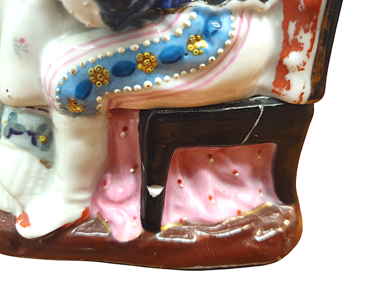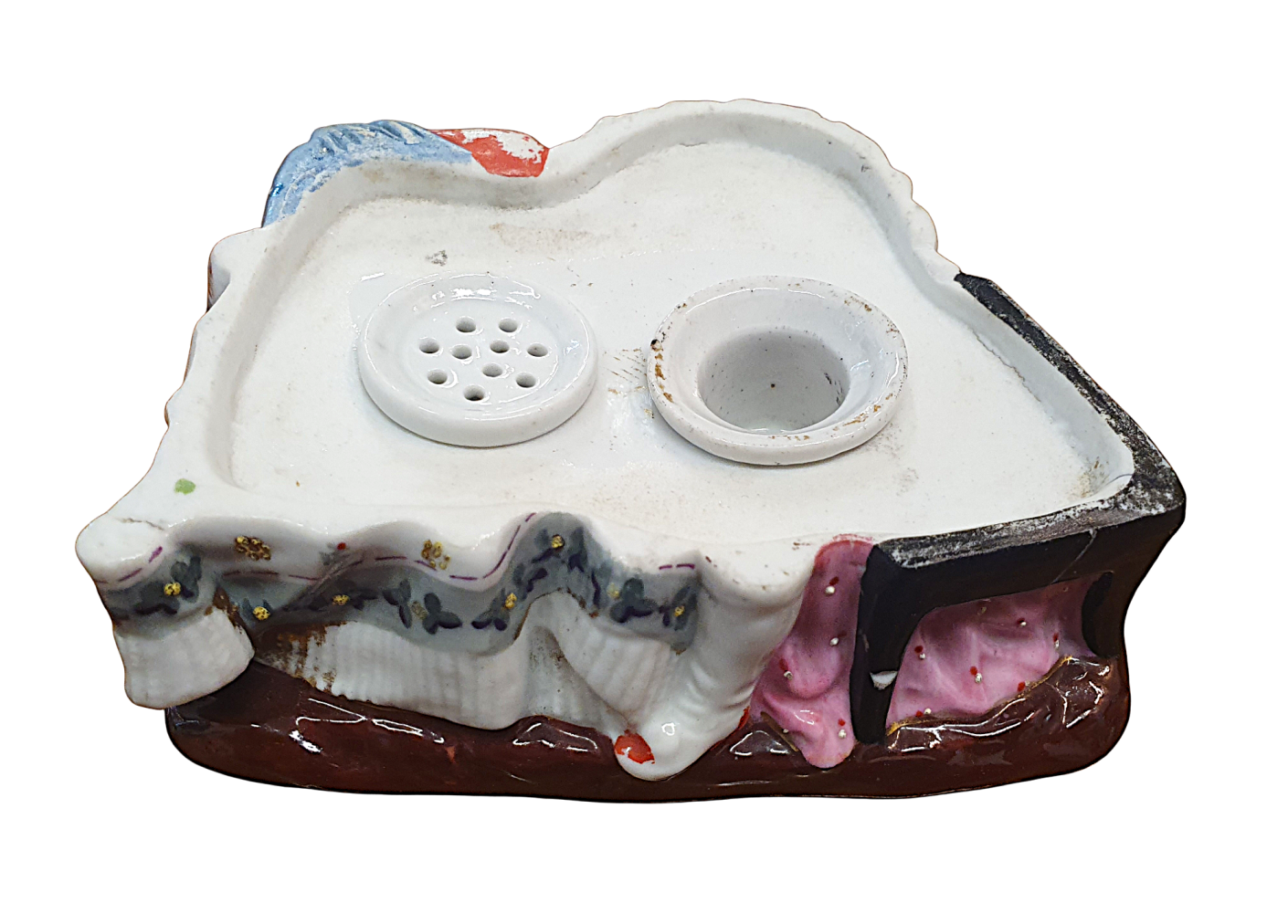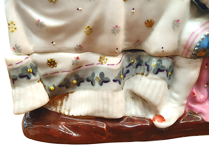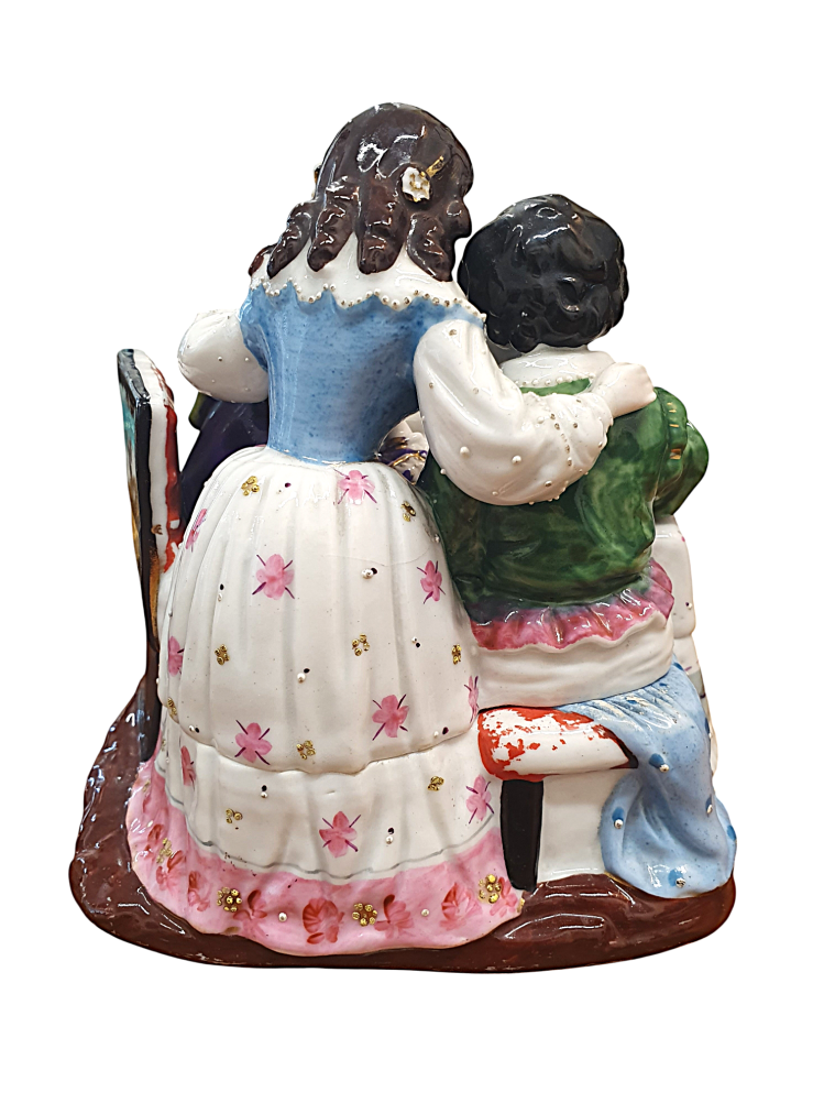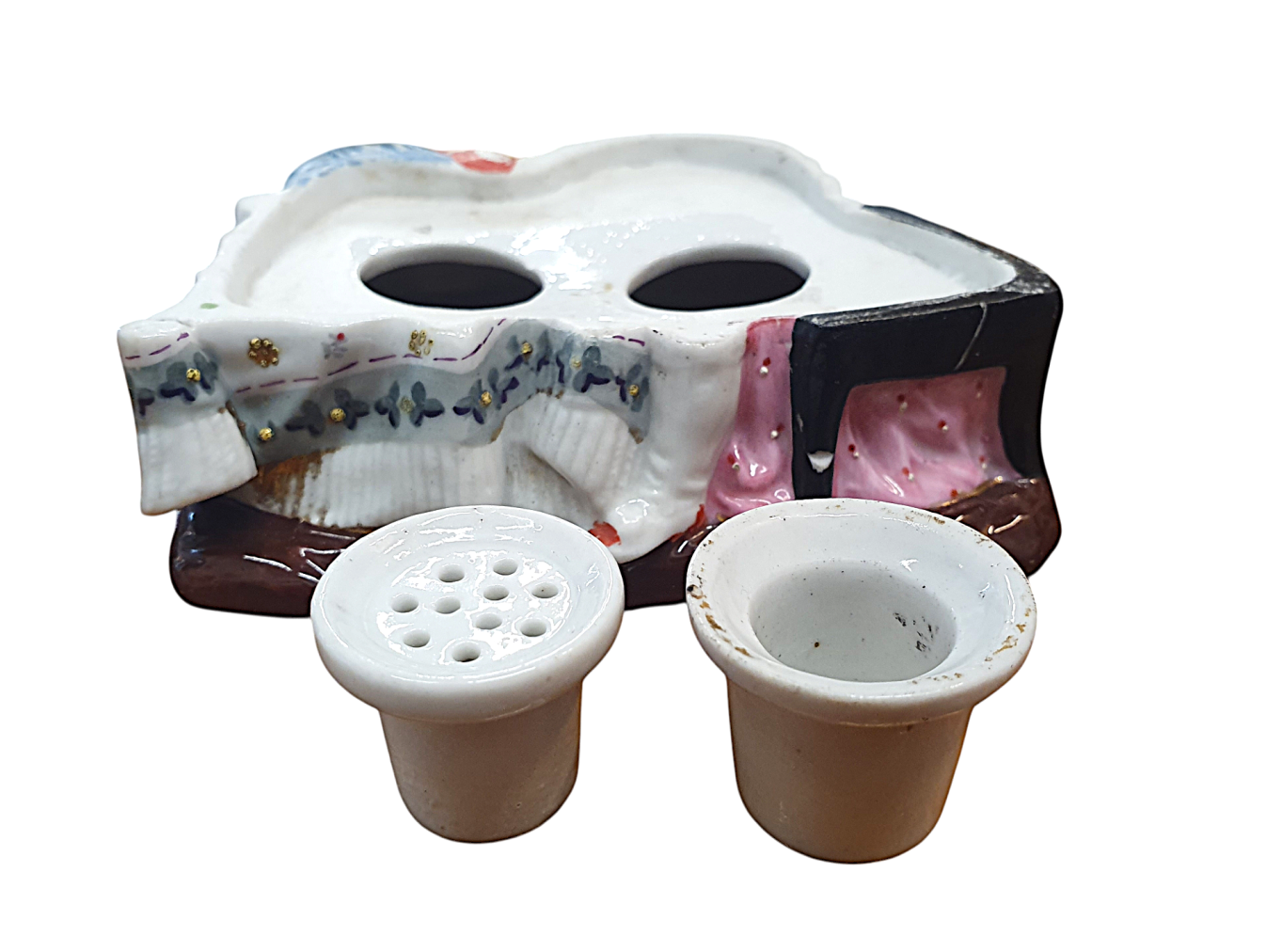 Krásná porcelánová soška, která ukrývá kalamář. Trojice děvčátek se naklání ke knize, všechny oblečené ve zdobných šatech s jemnými detaily. Výška 15 cm, v nejširším bodě 17 cm, podstava 10 x 13 cm, průměr nádobek 3 cm a 3,5 cm. Barva a zlacení místy setřené, místy jemné oťuky. Neznačeno. Polovina 19. století.