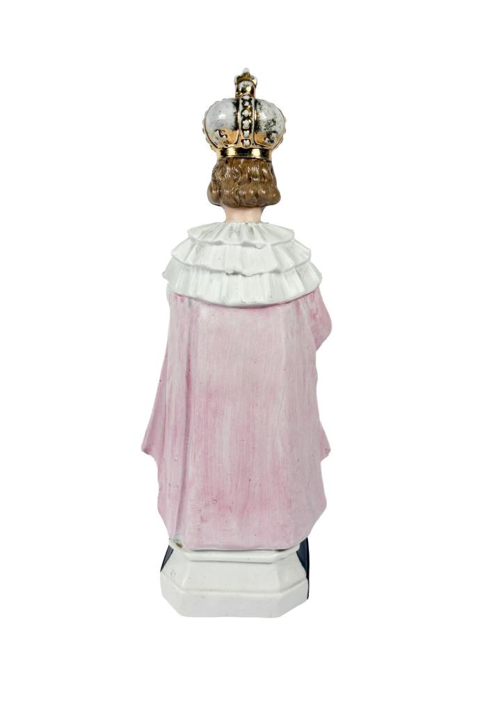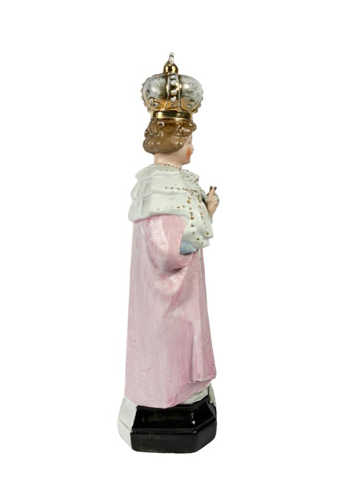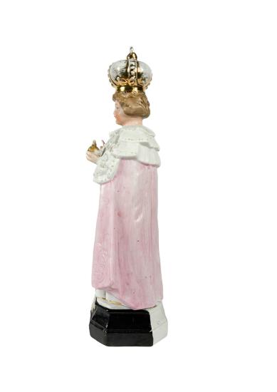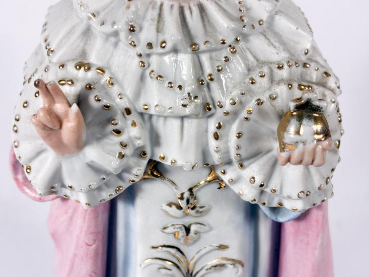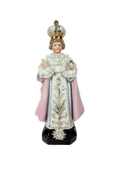 Porcelánová soška Pražského Jezulátka. Na sošce se střídají matné barvené plochy s lesklými, zlacenými detaily. Výška 28,5 cm, v nejširším bodě 12 cm, podstava 8,5 x 7,5 cm. Zlacení i barvy místy setřeny, viz foto, sošce chybí dva prsty, jinak v pěkném stavu.