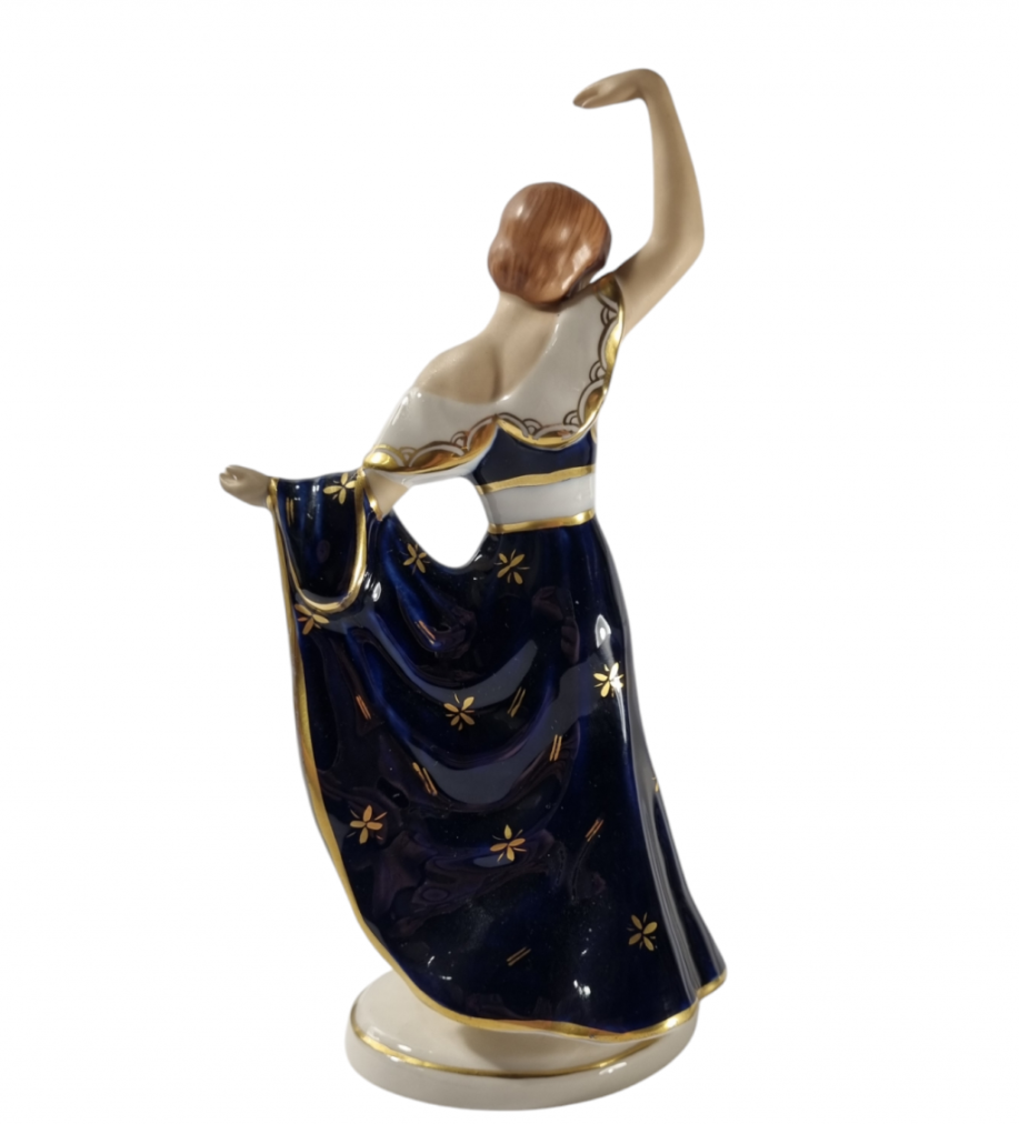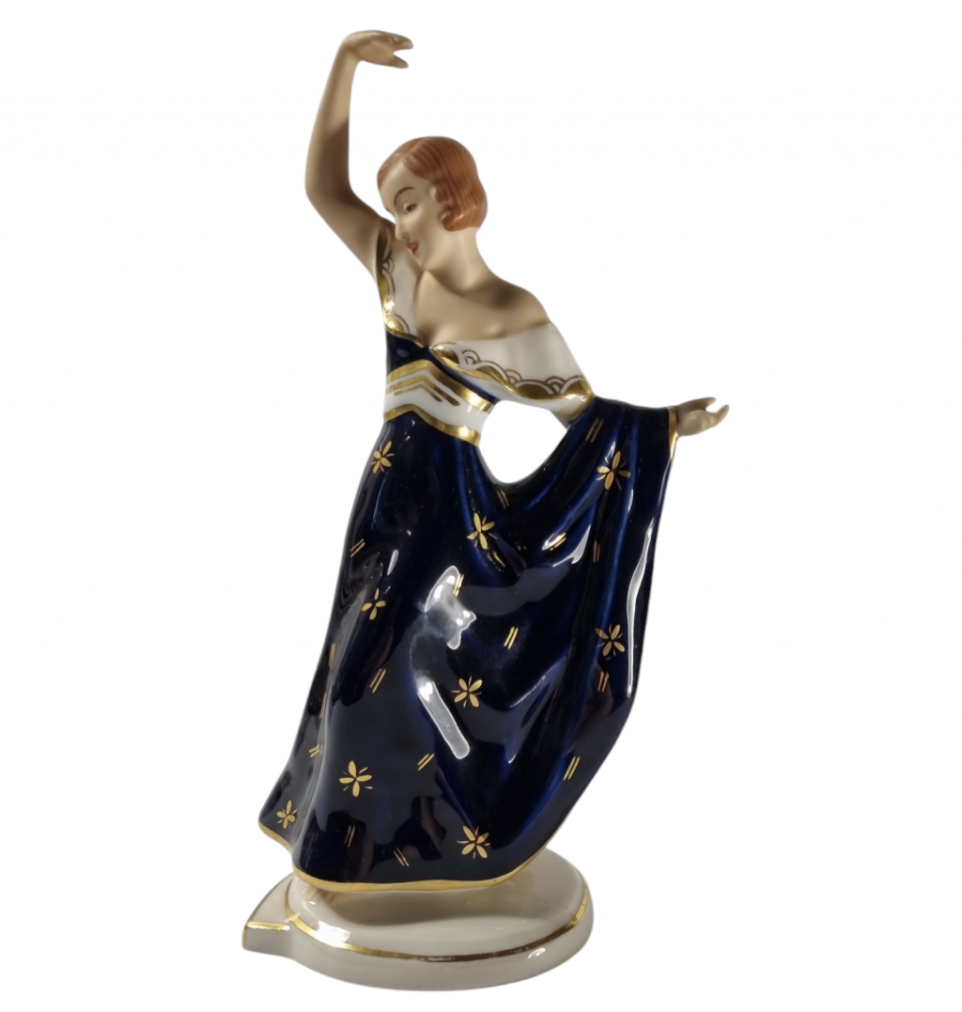 Porcelánová soška tanečnice v kobaltově modrých šatech se zlacenými detaily. Výška sošky je 24 cm, průměr podstavce je 9 cm. Značeno zespod Royal dux Bohemia.