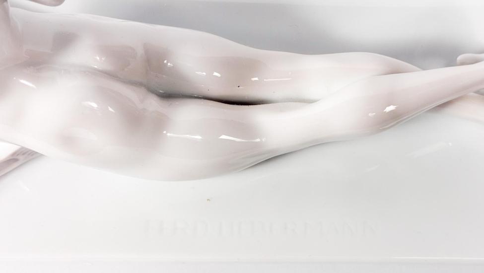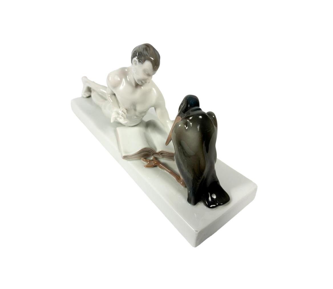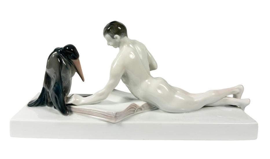 Nádherná porcelánová socha muže - filosova předčítající knihu čápovi marabu. Výška 13 cm, podstava 27,4 cm x 7,8 cm. Značeno vespod "Rosenthal". Autor Ferdinand Libermann.