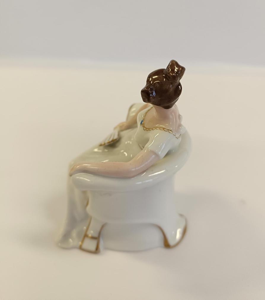 Porcelánová soška Dáma v křesle. Značeno ,,Rosenthal", Rozměry 9 x 5,54cm. Na jedné ruce ulomené prsty, viz foto.