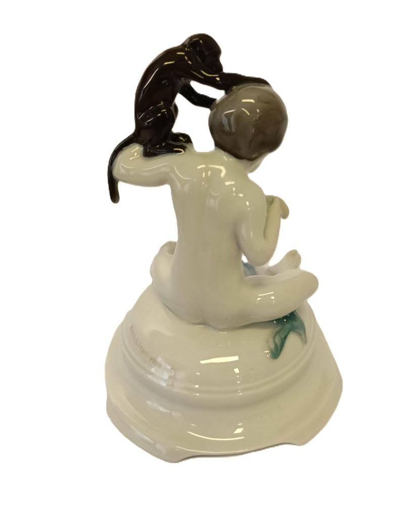 Porcelánová soška - putto a opice. Výška 14,5cm. Značeno Rosenthal, autor F. Liebermann. Bez poškození.