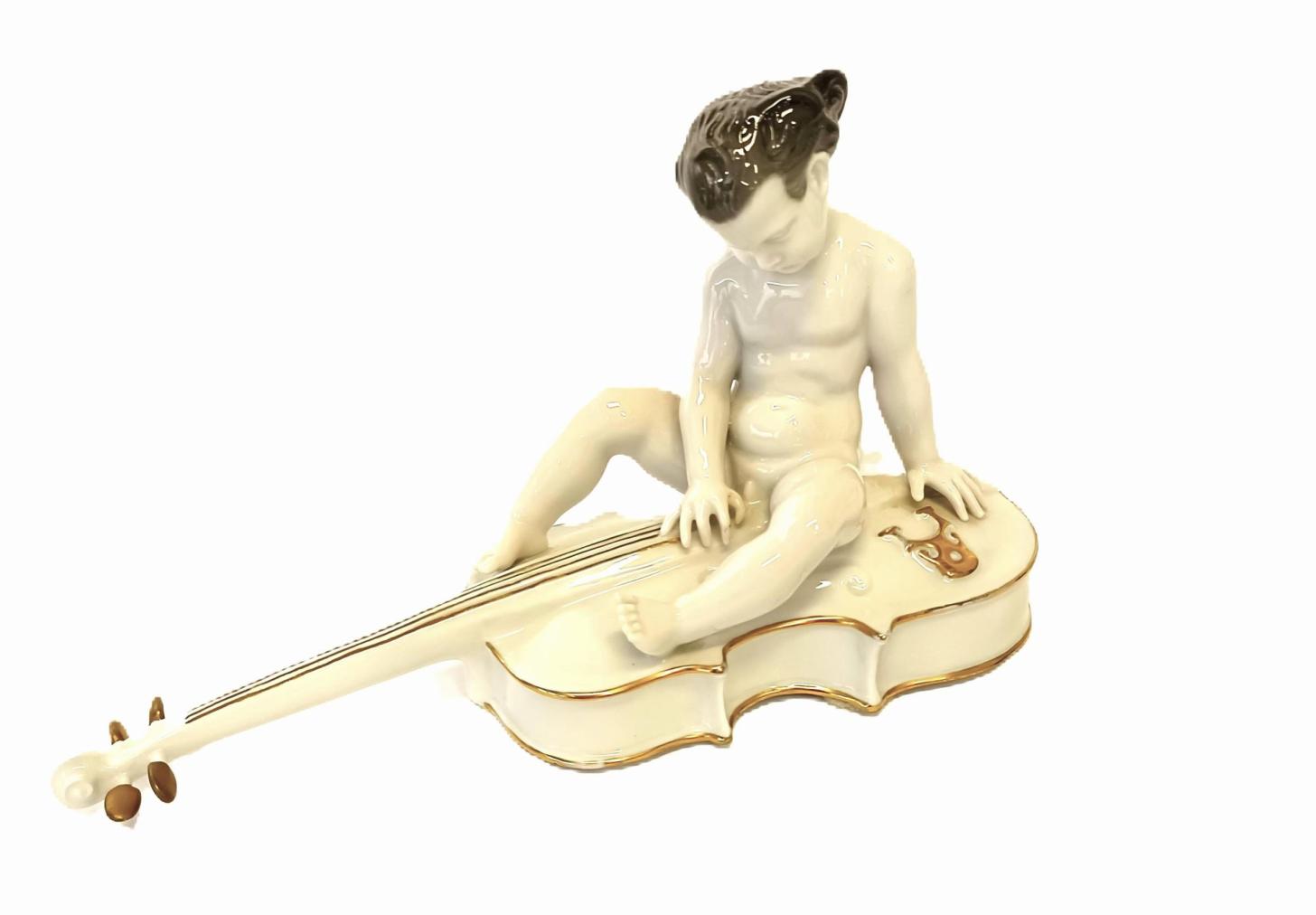 Porcelánová soška - putto na violoncellu. Rozměry: 20,5cmx12cmx7cm, . Značeno Rosenthal, autor F. Liebermann. Místy mírně setřená barva.
