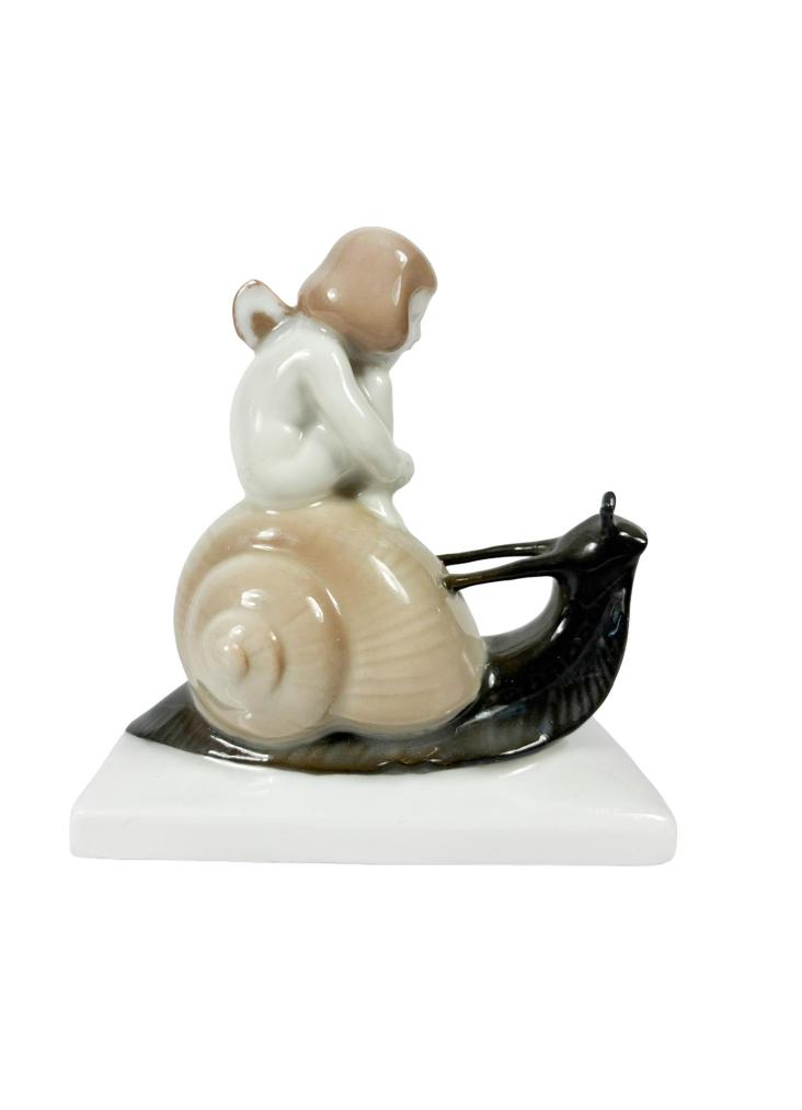 Půvabná porcelánová soška malého putti na šnekovi. Výška 9,5 cm, podstava 8,5 x 4,5 cm. Značeno vespod "Rosenthal". Bez poškození, perfektní stav.