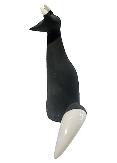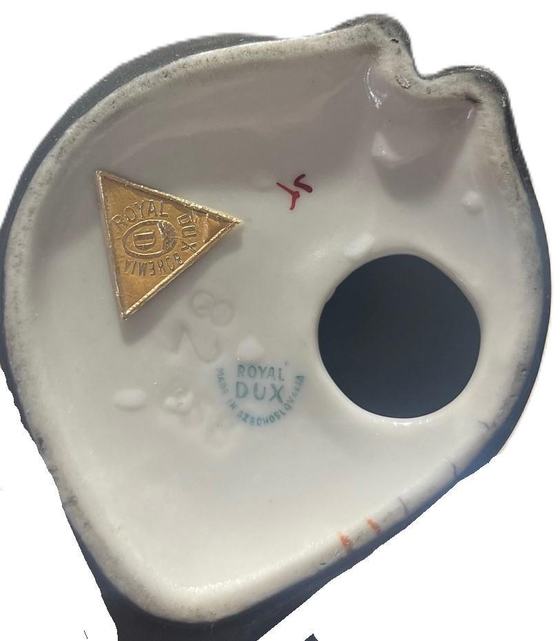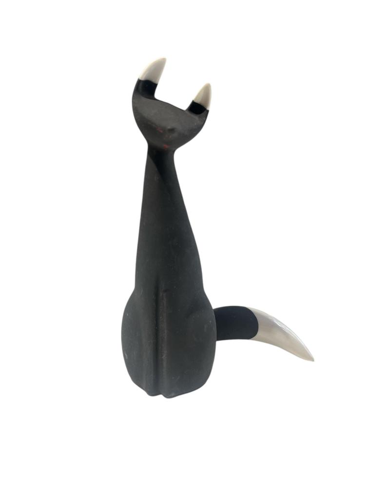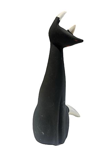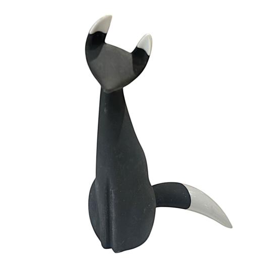 Krásná nadčasová soška v bruselském designu od autora Jaroslava Ježka, pro porcelánku Royal Dux. Jedná se o sedící černou lišku z biskvitového porcelánu s bíle glazovanými špičkami uší a chvostu. Soška je místy lehce ošoupaná na čumáku má stopy po červené barvě, která půjde odstranit. Jinak bez poškození a ve velmi pěkném stavu. Na výšku měří 20,5 cm, na šířku i s ocasem 15 cm. Hloubka je 10 cm. Značeno ze spodní strany podstavy- Royal Dux.