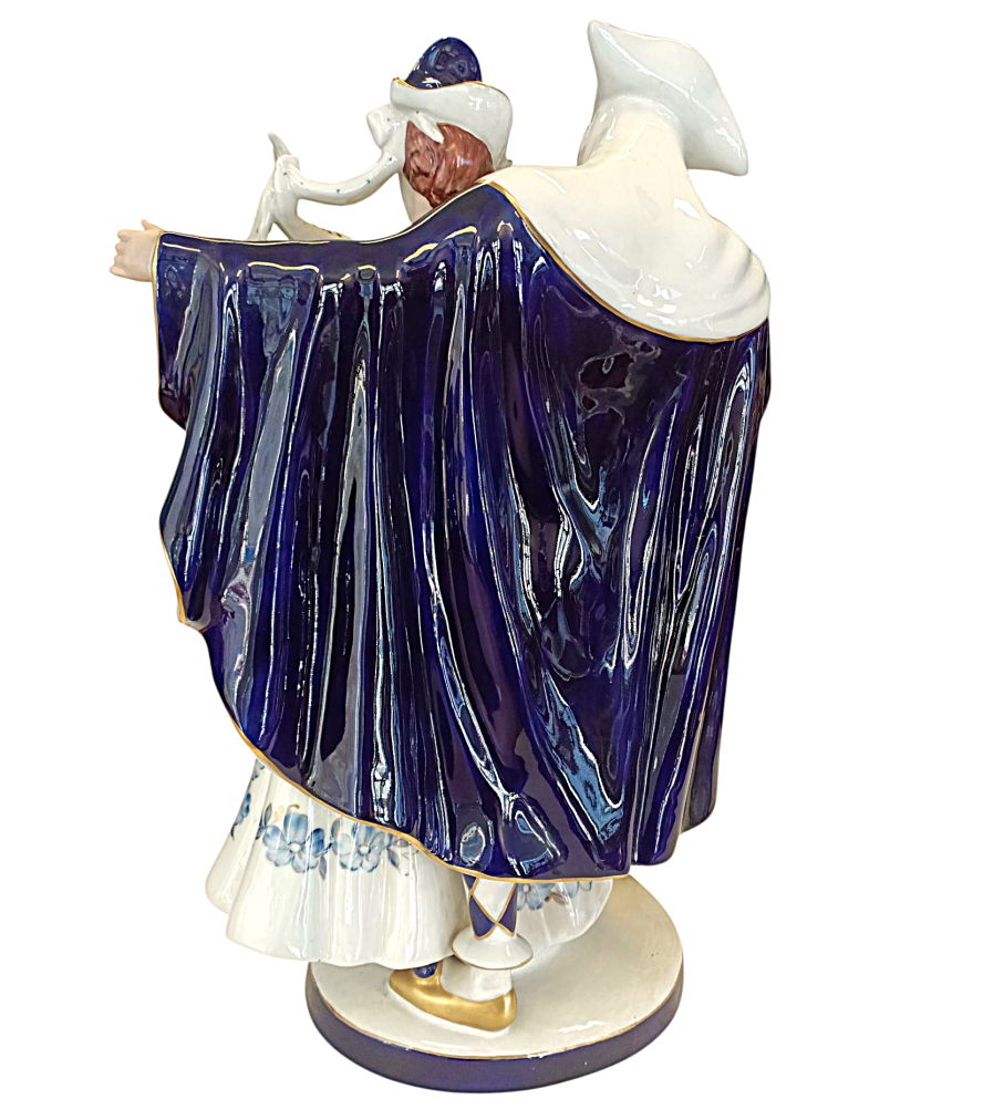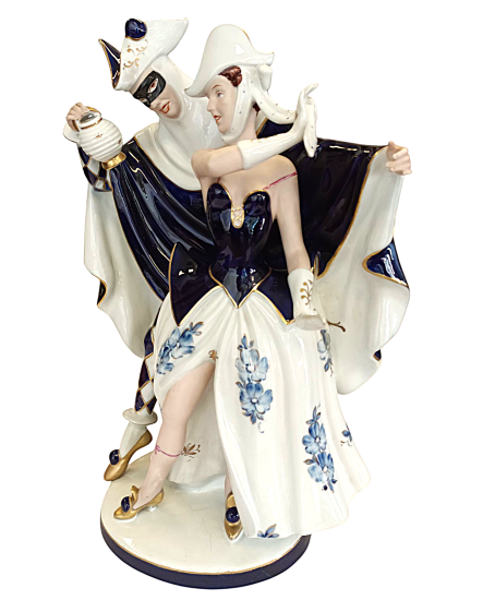 Karnevalové postavy Pierot a Kolombína. Bílý glazovaný porcelán s ručně malovanými kobaltovými a zlatými detaily. Výška 50 cm. V nejširším bodě 34 cm. Na spodní straně značeno Royal Dux. Stav viz foto, bez poškození.