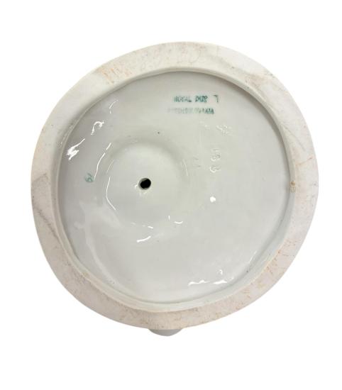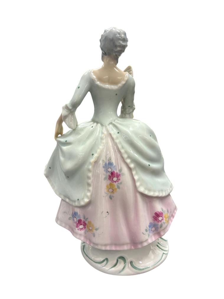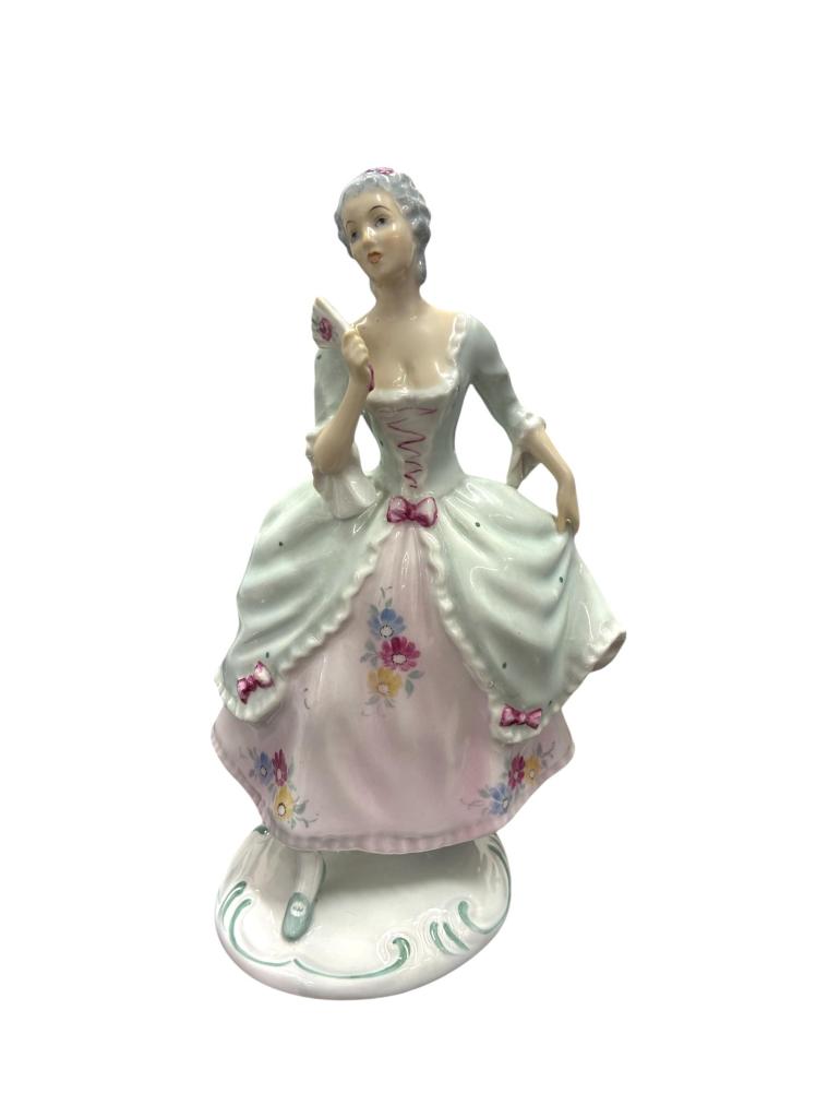 Dekorativní soška dámy v rokokových šatech, které si přidržuje při chůzi a ovívá se vějířem. Soška pochází z firmy Royal Dux, jejíž značka se nachází vespod. Soška má krásné pastelové barvy kombinované s jemnými ručně malovanými květinami a je bez poškození. Na výšku ma 21 cm a podstavec má průměr 9 cm.