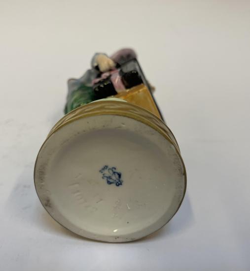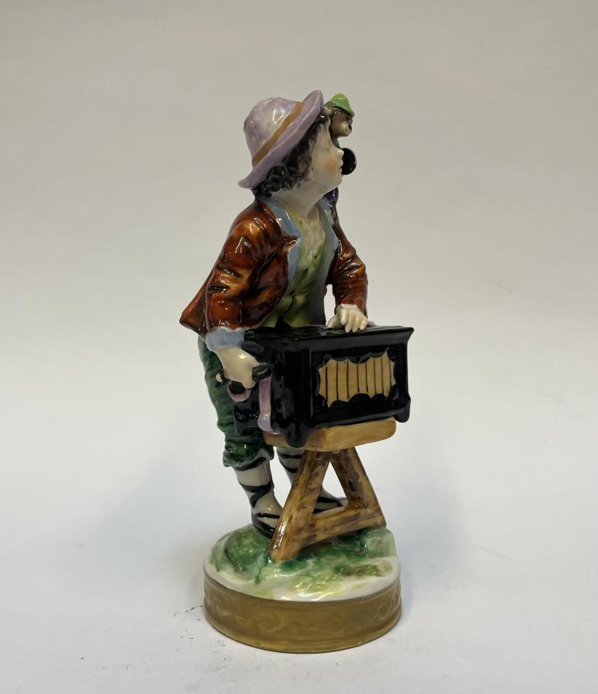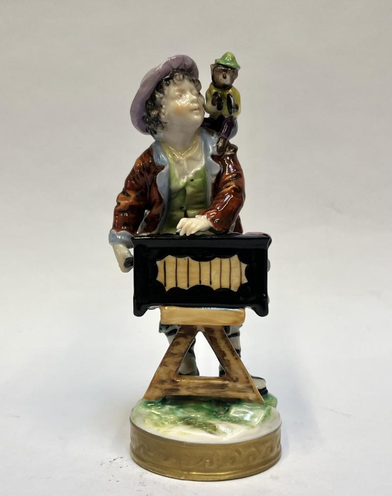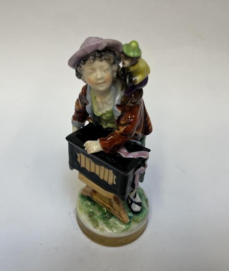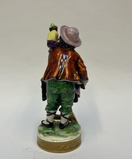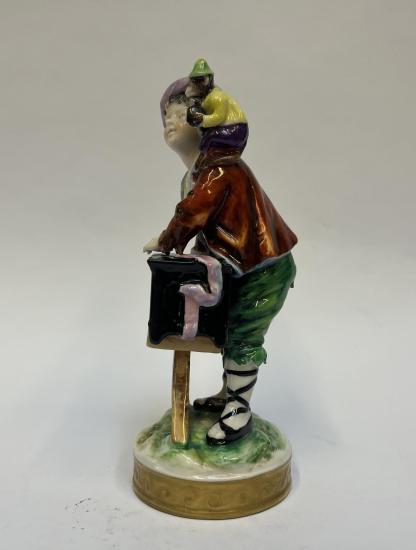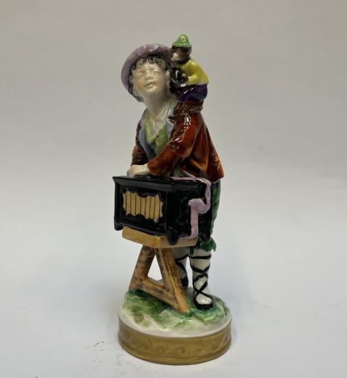 Starožitná porcelánová soška značky Volkstedt Rudolstadt, představující chlapce s opičkou na rameni, hrajícího na flašinet. Figurka se vyznačuje sytou barevností a jemnými detaily. Na výšku měří 15 cm i s podstavcem, v nejširším bodě 6 cm. Hloubka je 5,5 cm a průměr podstavce je 5,5 cm. Bez poškození, pouze na některých místech setřená barva, např. v oblastí očí nebo činelů které drží opice. Značeno ze spodní strany dole modrou značkou Rudolstadt.