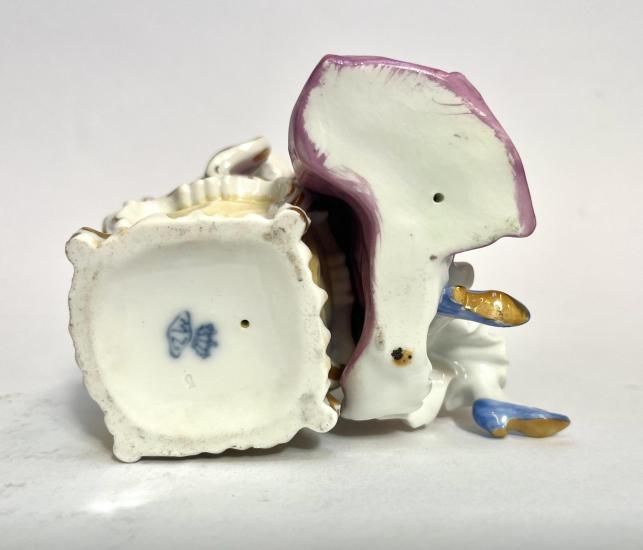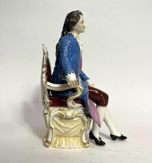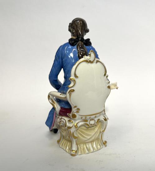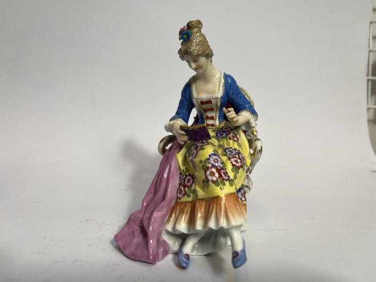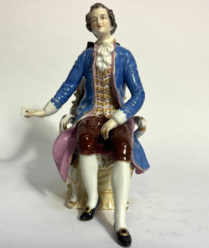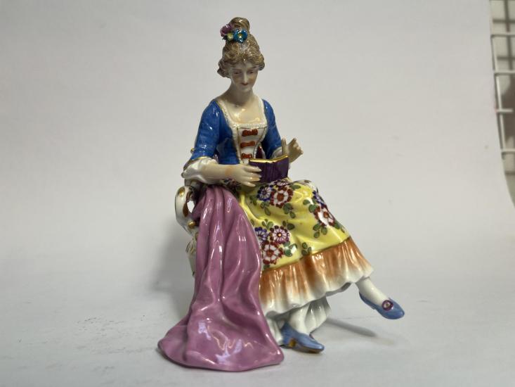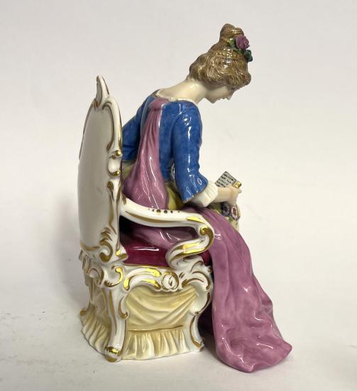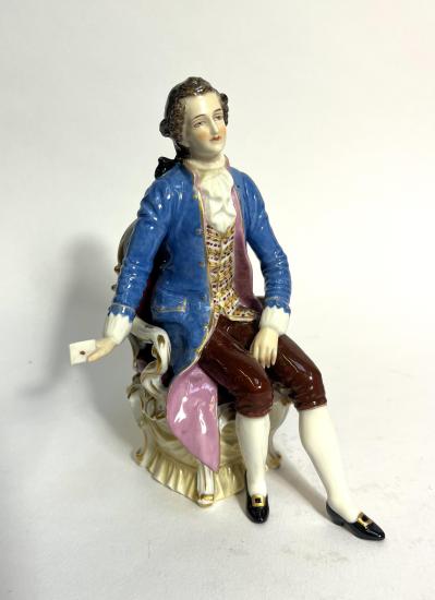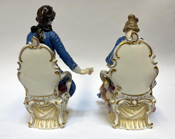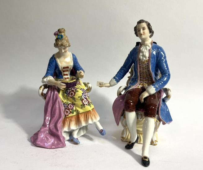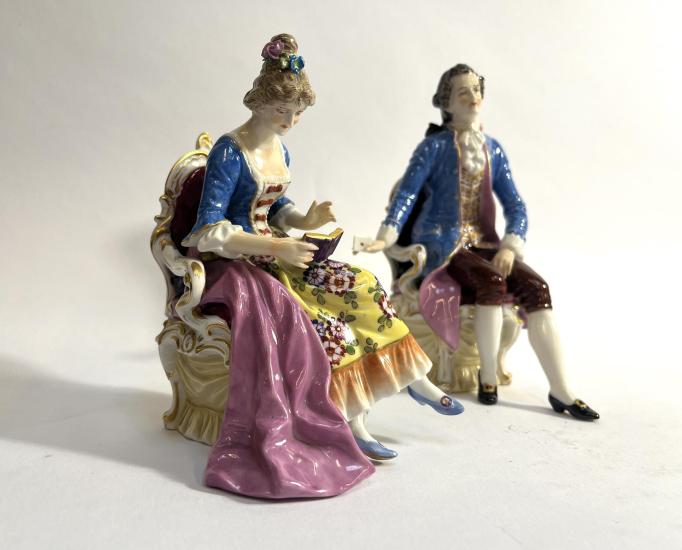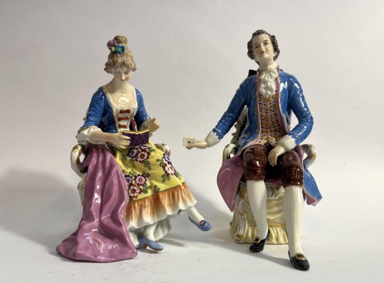 Starožitné porcelánové sousoší značky Rudolstadt. Jedná se o dvě samostatné figurky muže a ženy v rokokovém stylu, sedící na zdobených polstrovaných židlích. Mladík kouká zamilovaně před sebe a podává dívce malou obálku, ta má však skloněnou hlavu a čte knihu. Obě sošky jsou pečlivě ručně dekorovány sytými barvami a detailními vzory. V nejvyšším bodě měří muž 15 cm, žena 14 cm. V neširším bodě měří muž 10,5 cm, žena 9 cm. Hloubka- muž 10,5 cm, žena 10 cm. Značeno ze spodní strany podstavy modrou značkou MZ. Oba kusy jsou v perfektním stavu bez poškození.