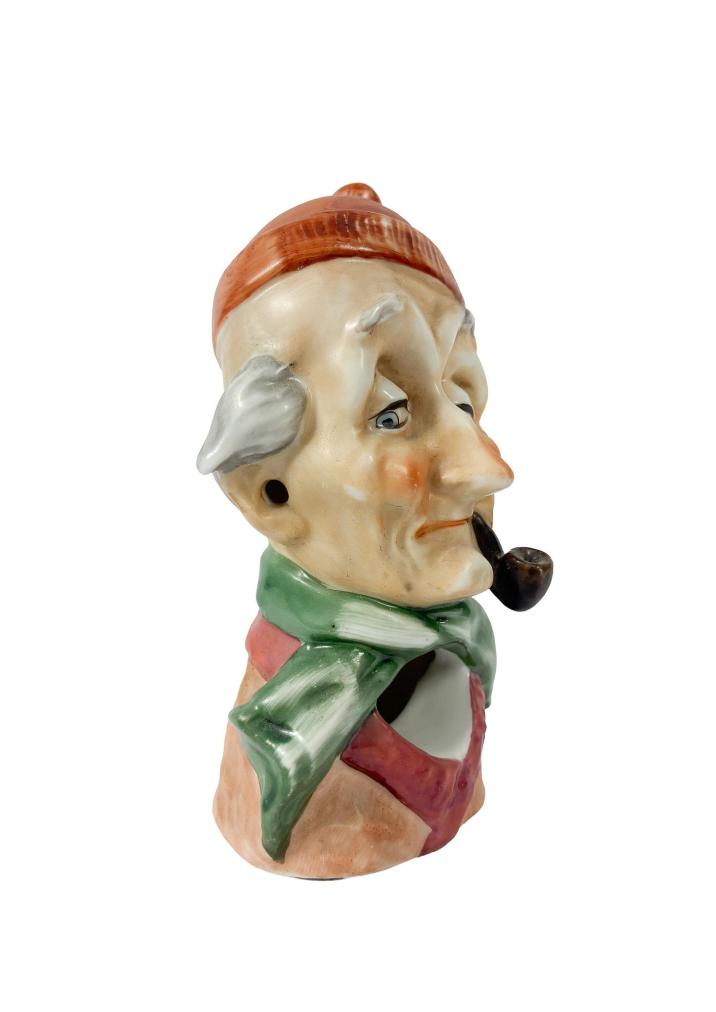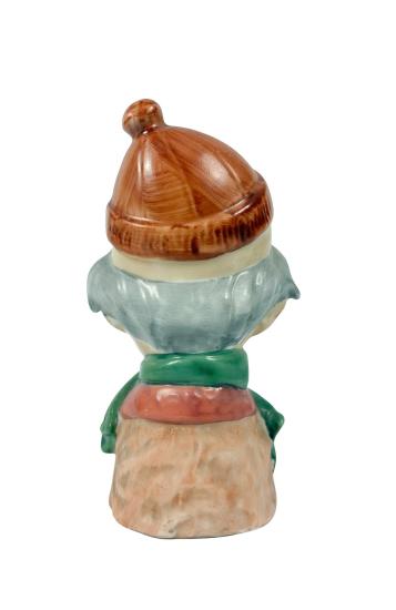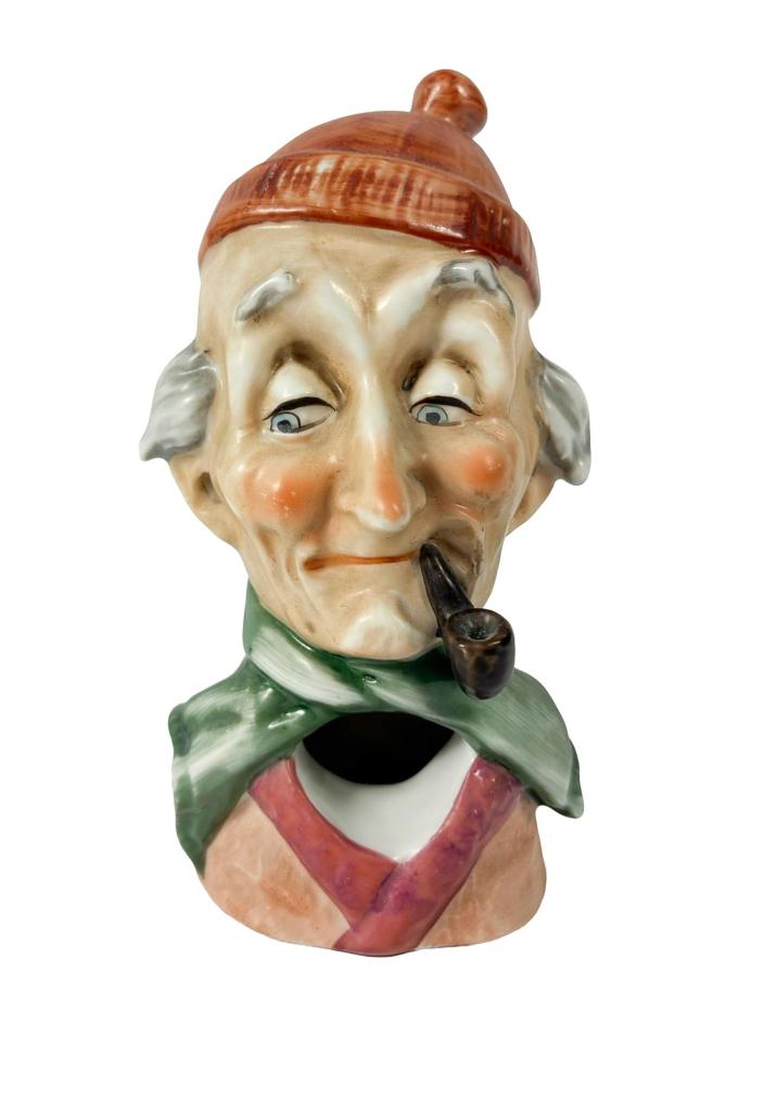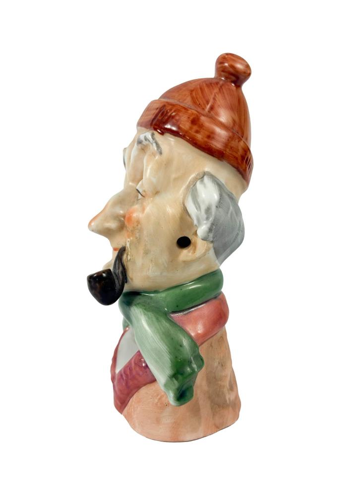 Milá porcelánová soška dědy s fajfkou v ústech. V místech uší jsou malé otvory, stejně tak pod šálou. Výška 12,5 cm, v nejširším bodě 7 cm, podstava 5,5 x 4,5 cm. Neznačeno. Barva místy setřena, jinak bez poškození. Neznačeno