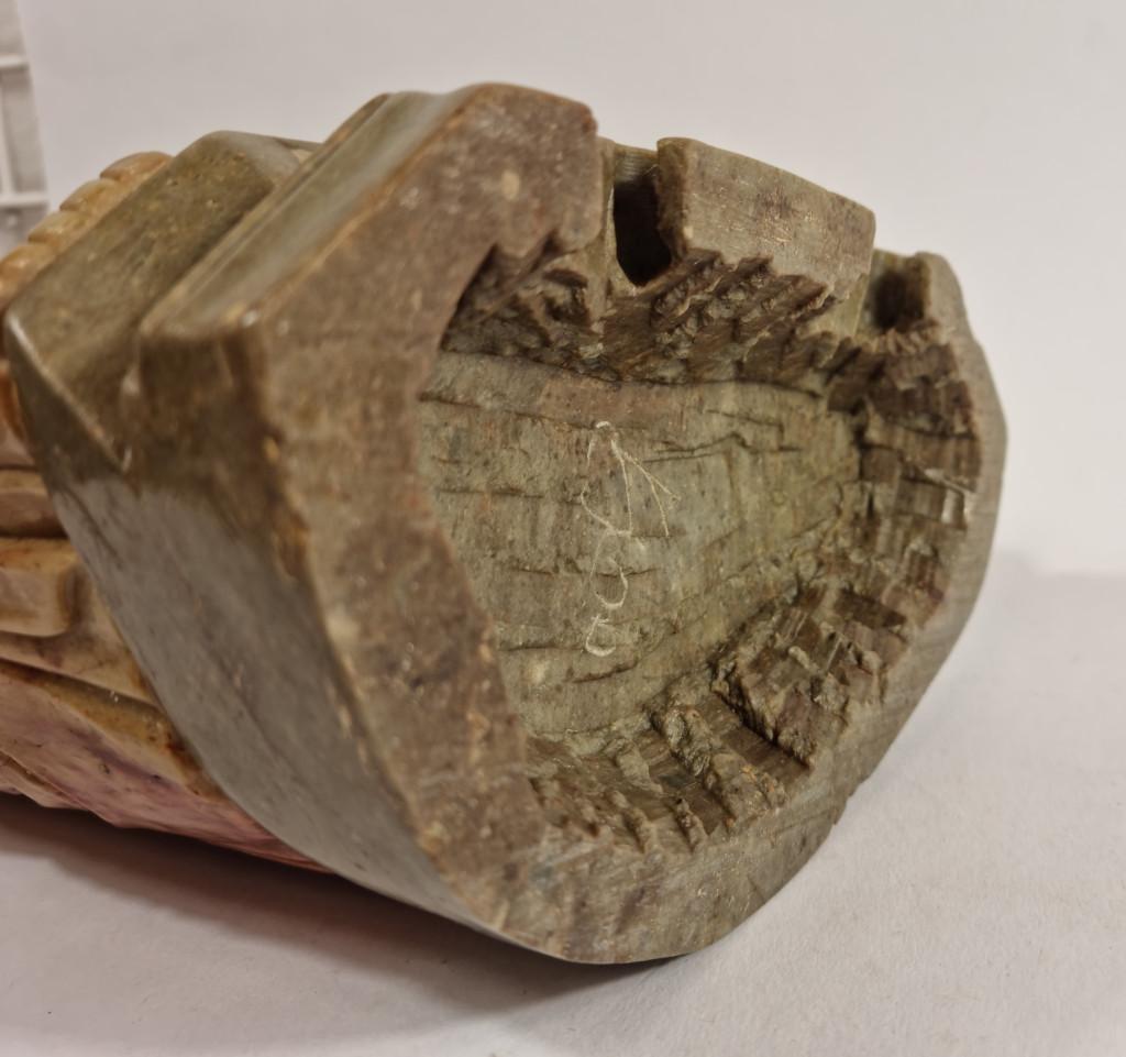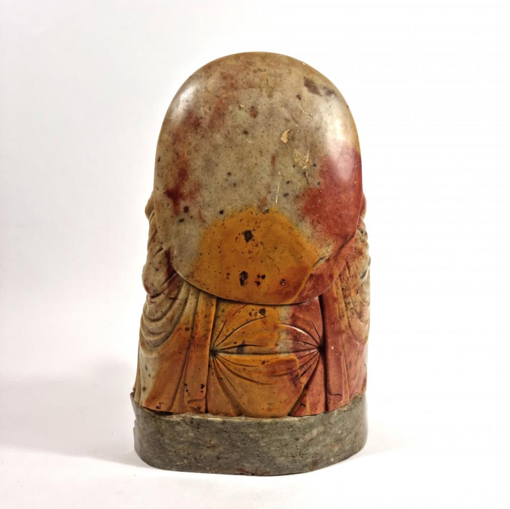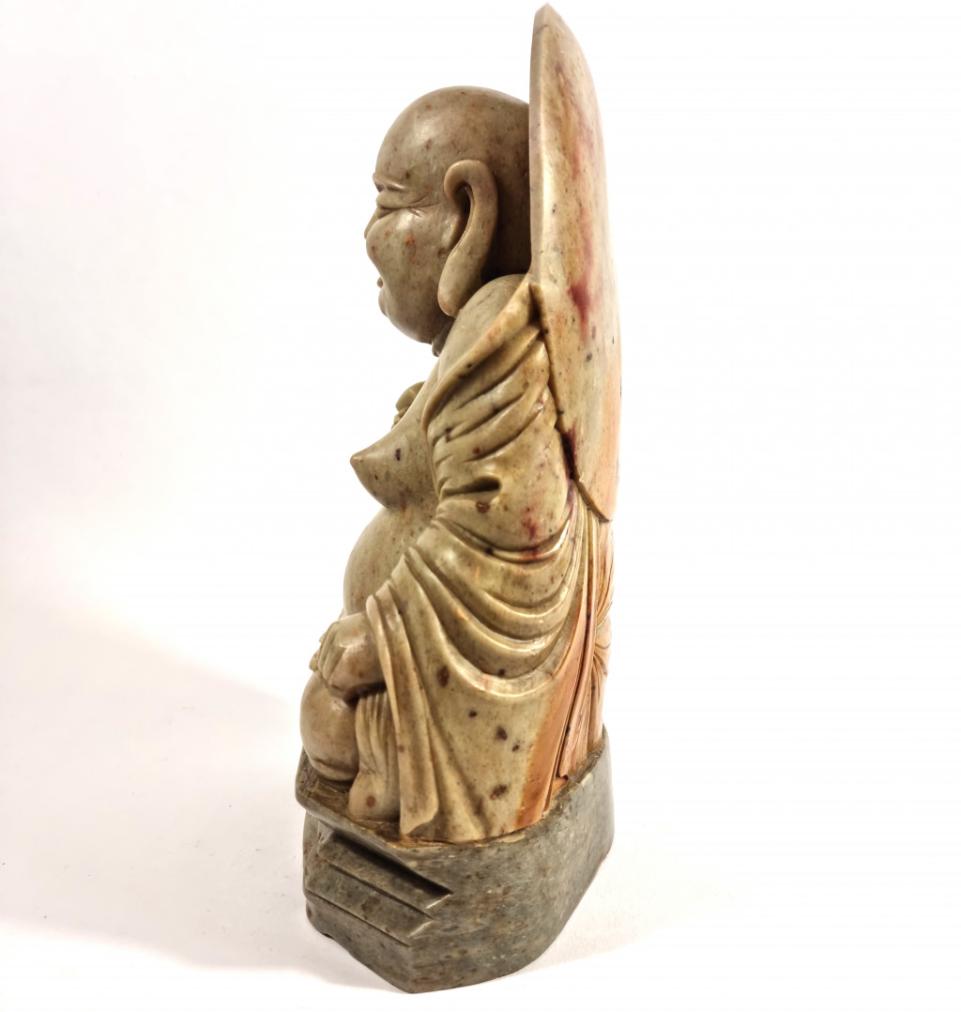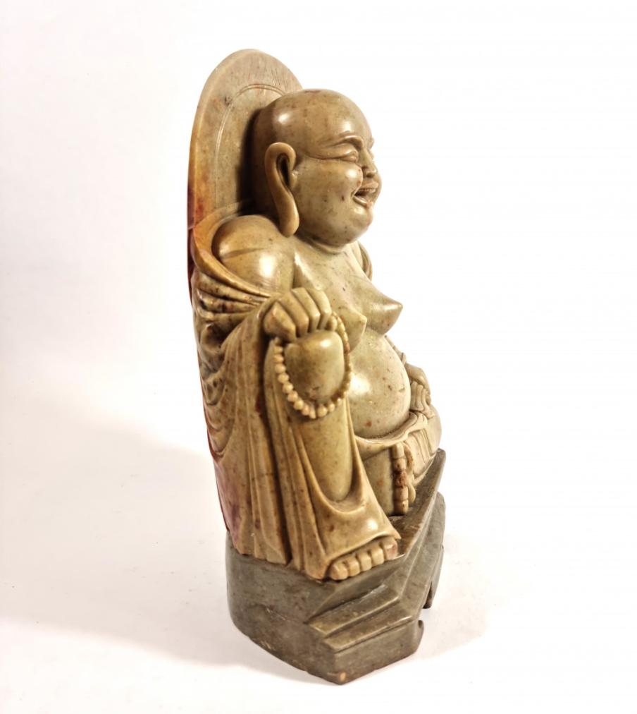 Kamenná socha z mastku. Smějící se Buddha sedící na podstavci. Díky preciznímu zpracování detailů působí socha velmi realisticky. Neznačeno. Výška 24 cm. Šířka 16,5 cm. Socha je ve velmi dobrém stavu.