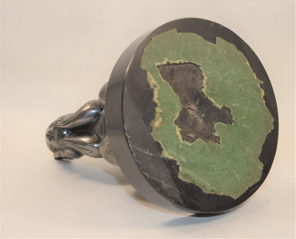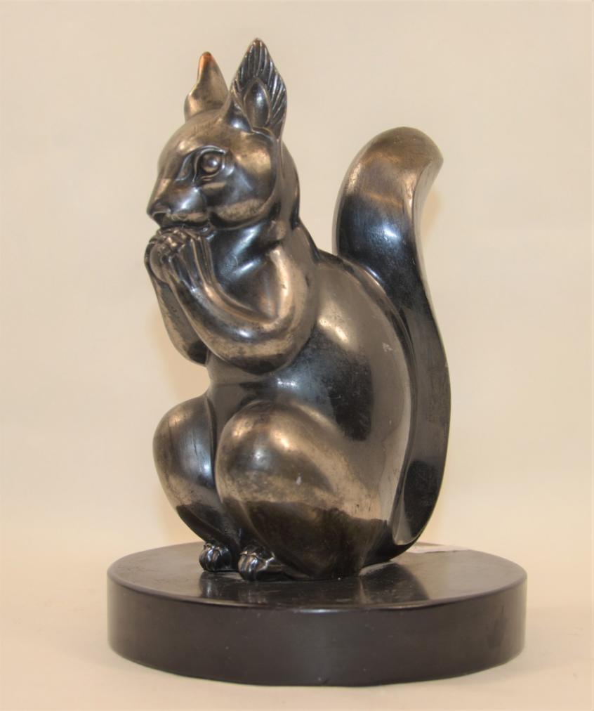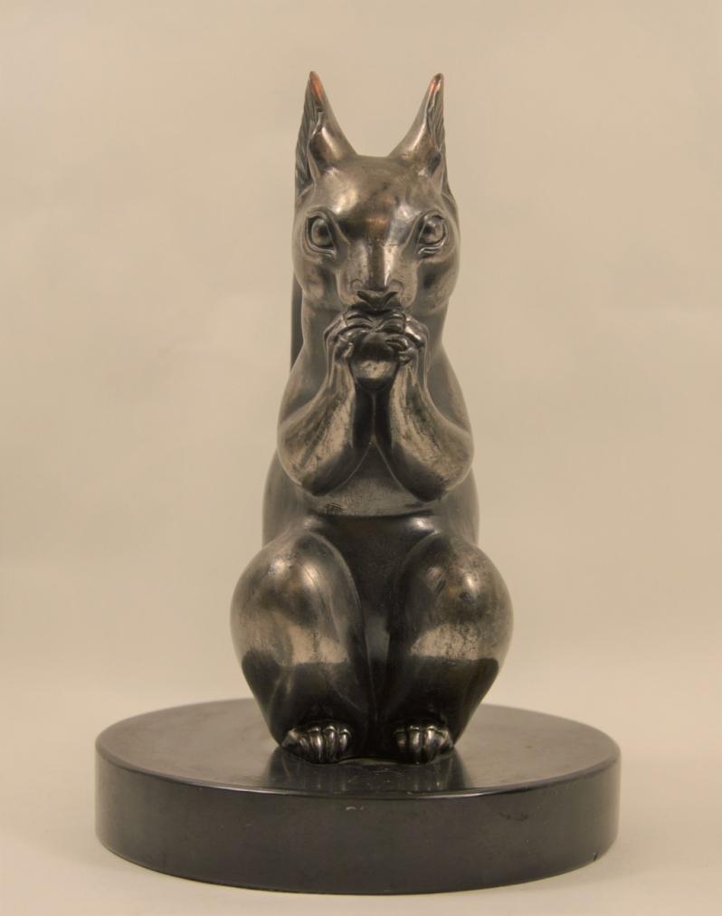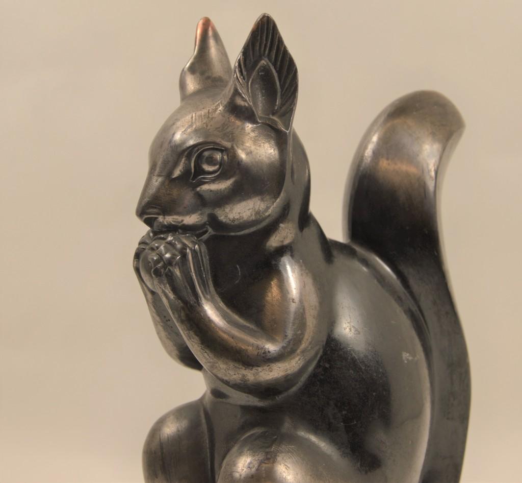 Kovová soška veverky je vysoká včetně soklíku 20 cm, průměr soklu 12 cm. Jedno ouško má setřenou vrstvu a prosvítá lehce měděná barva.