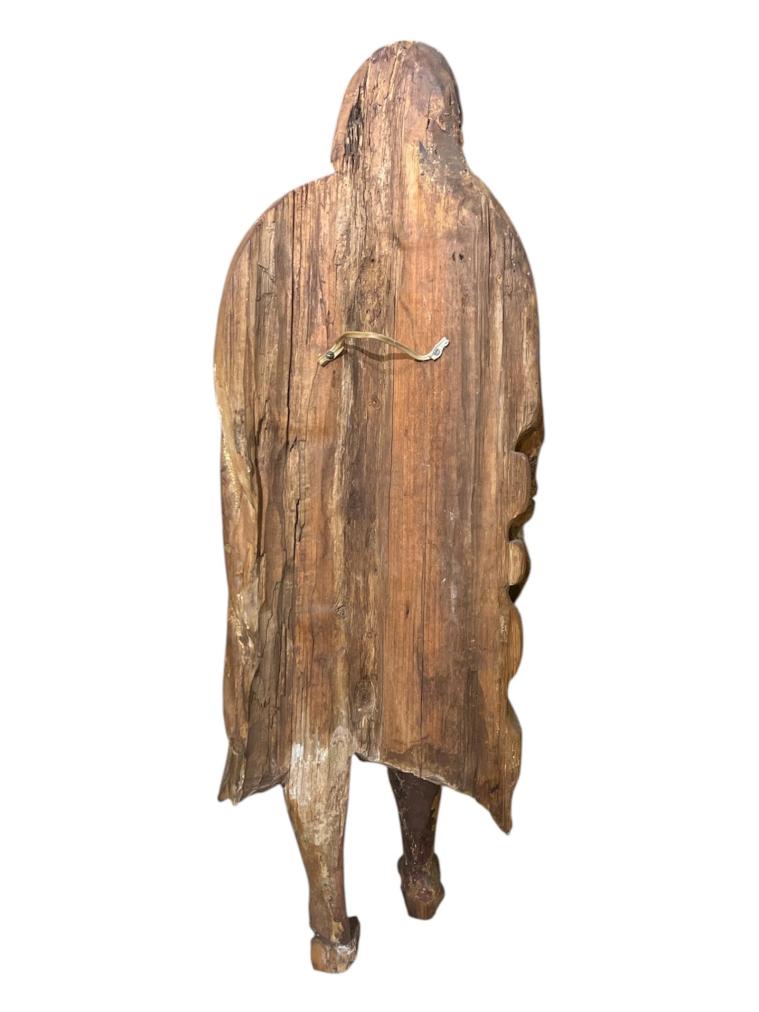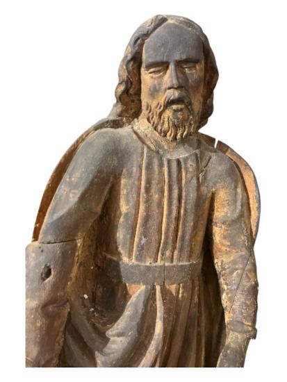 Starožitná, ručně vyřezávaná socha muže. Velká část sochy je z jednoho masivu dřeva, pravá ruka je z druhého kusu a je připevněna k předloktí. Celková výška je 85 cm, šířka je 32 cm. Hloubka je 20 cm. Stav a poškození dřevěné sochy odpovídá stáří, chodidla jsou uštípnutá a barva/lak/povrchová úprava je na většině plochy oloupaná, případně se drolí. Ze zadní strany je dílo opatřeno šroubky a pogumovaným drátem pro zavěšení. Neznačeno.