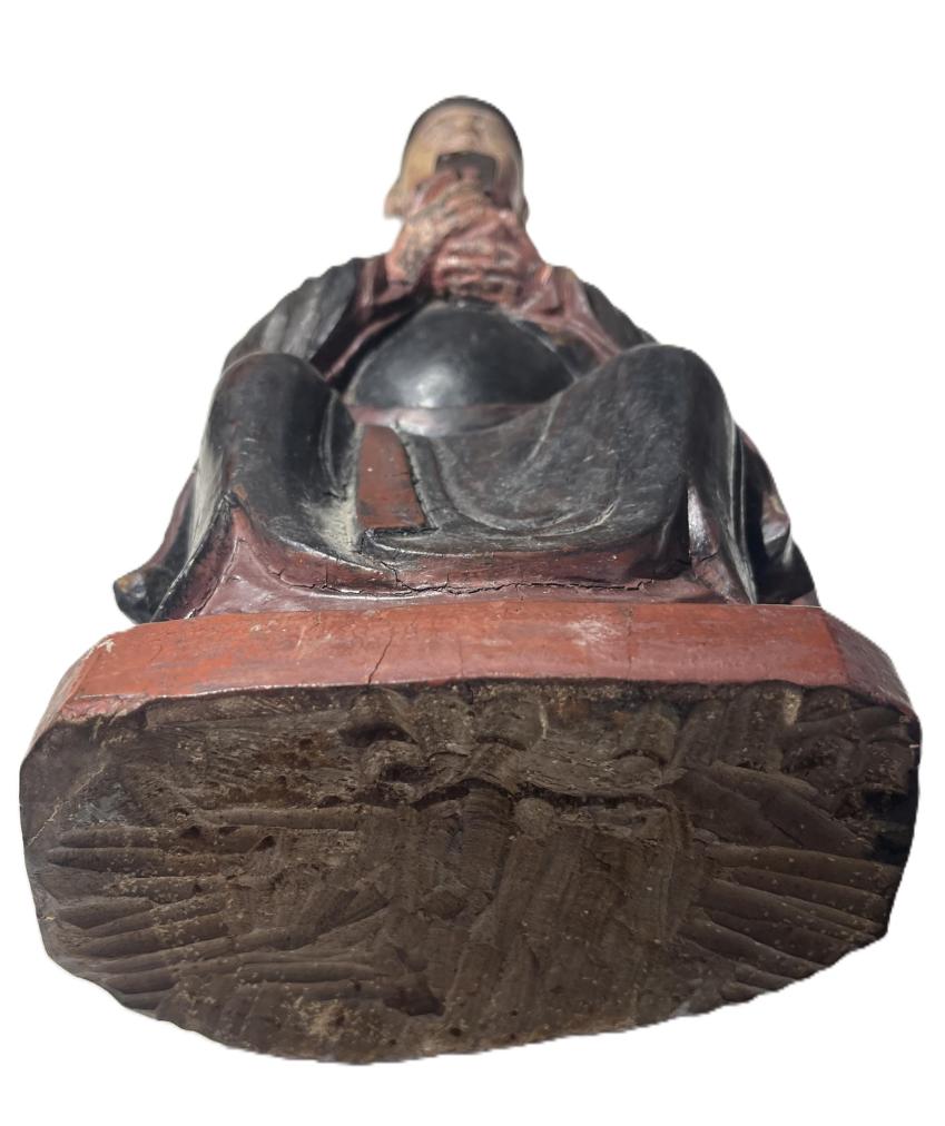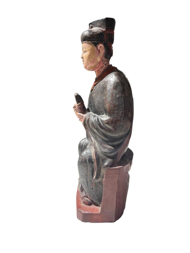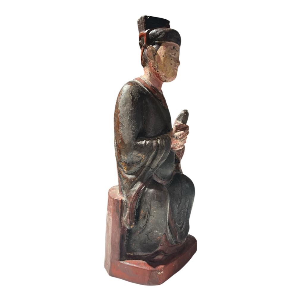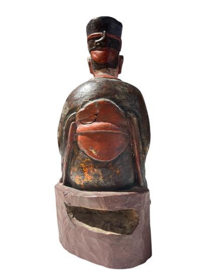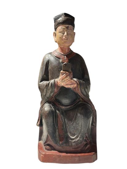 Starožitná dřevěná socha s původní polychromií, ručně vyřezávaná a zdobená. Vyobrazuje sedícího muže v tradičním oděvu. Čína, druhá polovina 19. století. Socha nese známky času a stopy po používání viz foto. Na výšku měří 38 cm, v nejširším bodě měří 15 cm. Hloubka je 12 cm. Rozměry podstavy jsou 16 x 12 cm. Neznačeno.