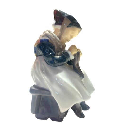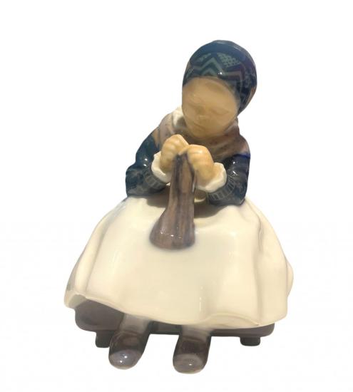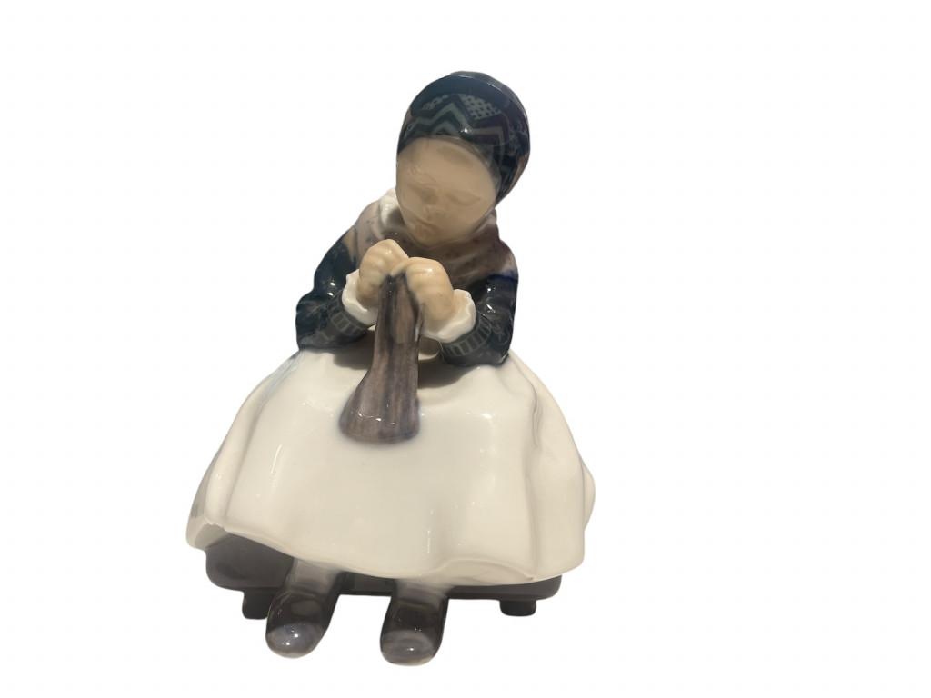 Porcelánová figurka dívky dětských rysů, v čepci a zástěře. Dívka sedí na lavici a soustředěně vyšívá nebo opravuje látku. Na výšku měří soška 15 cm, na šířku 11 cm. Tloušťka/ hloubka je 10 cm. Značeno ze spodní strany dole Royal Copenhagen s korunkou a číslemi 1314. V perfektním stavu bez poškození.