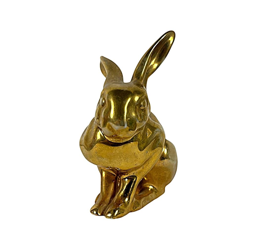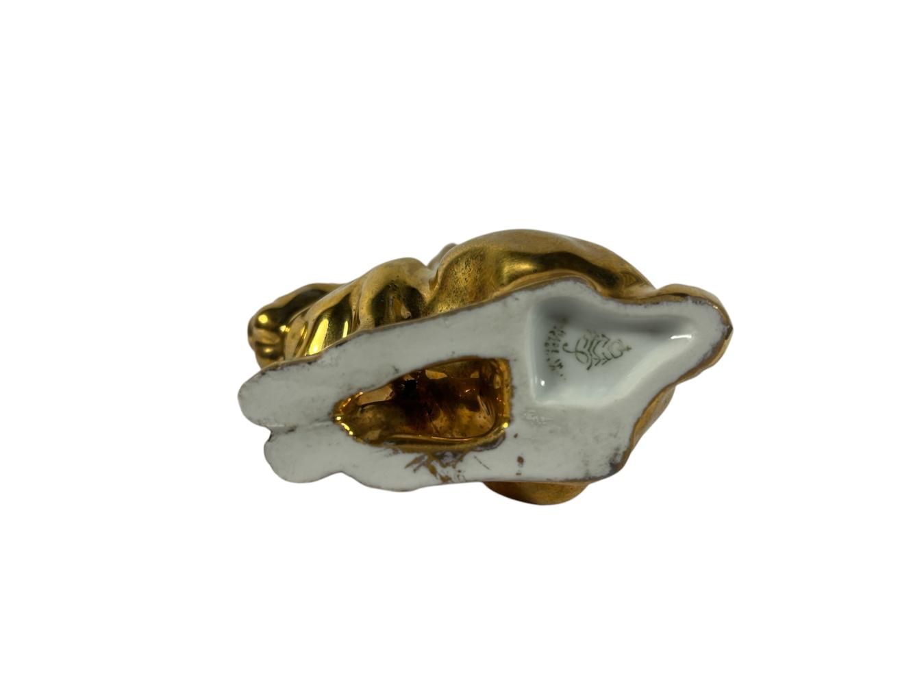 Porcelánová pozlacená soška zajíce, značeno Horní Slavkov. Zlacení je na více místech lehce setřené. Délka podstavy je 6,5 cm, výška sošky je 8 cm a délka v nejširším bodě je 8,5 cm.