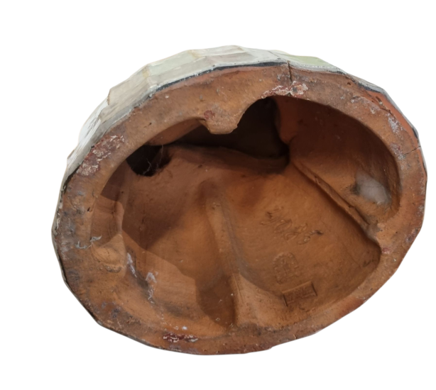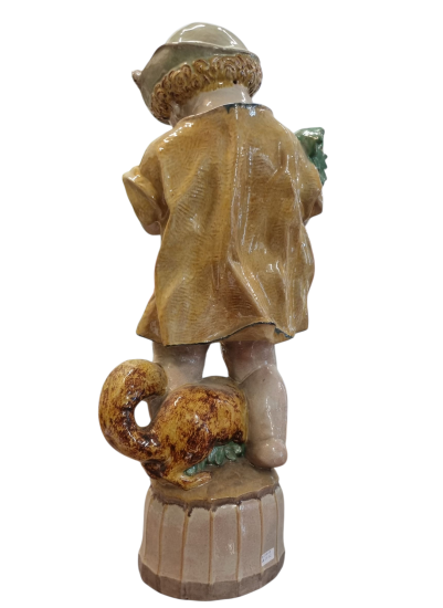 Unikátní velká porcelánová socha Puttiho v podzimním provedení, od rakouského sochaře jménem Michael Powolny. Putto je oblečen do okrové halenky se zeleným lemováním a do zelené čapky. Drží v rukou šťavnatý hrozen červeného vína a u jeho bosých mohou vidíme věrného čtyřnohého společníka. Socha měří na výšku 73 cm, v nejširším bodě 31 cm. Průměr podstavy je 20 cm. Značeno ze spodní strany dole značkou viz foto Wiener kunst keramik. Podstavec je vysoký 13 cm. Na podstavci se z přední strany nachází mělká prasklina cca 3 cm dlouhá a na pravé můžeme vidět modrý kapanec glazury, výrobní vada.