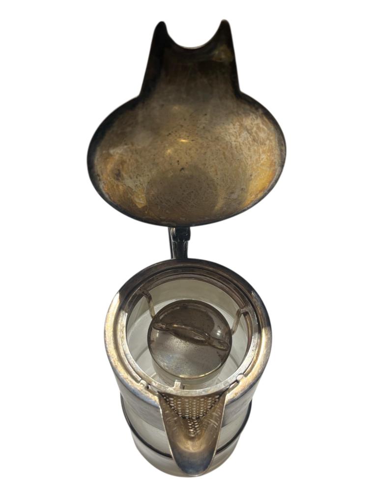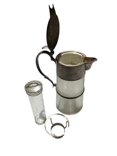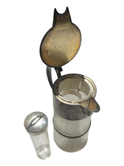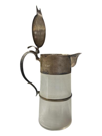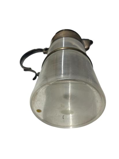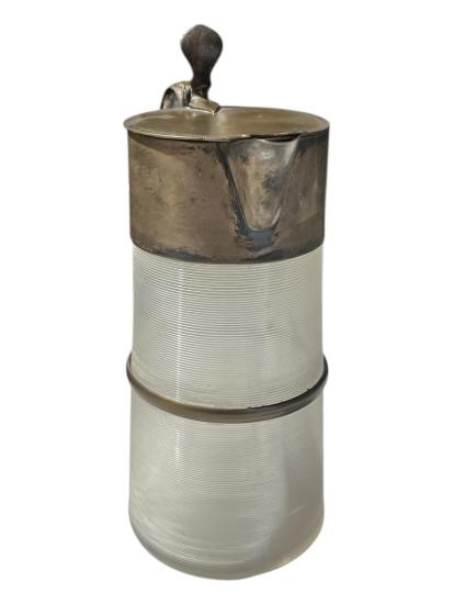 Starožitný džbán na vodu opatřený kovovými částmi- uchem, nálevkou a uzavíratelným víkem. Uvnitř je konstrukce držící skleněnou uzavíratelnou nádobku na led. Celková výška je 28 cm, průměr hrdla je 10 cm, průměr podstavy je 12 cm. Sklo je vroubkované a ze přední strany mají vroubky drobné oděrky viz foto. Kovová část je bez chromování, místy se nacházejí tmavé skvrny nebo mapy. Jinak bez poškození. Neznačeno.