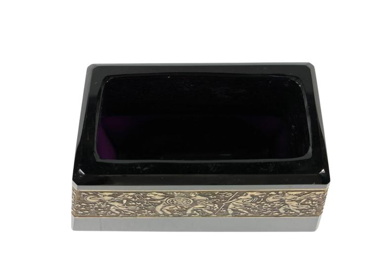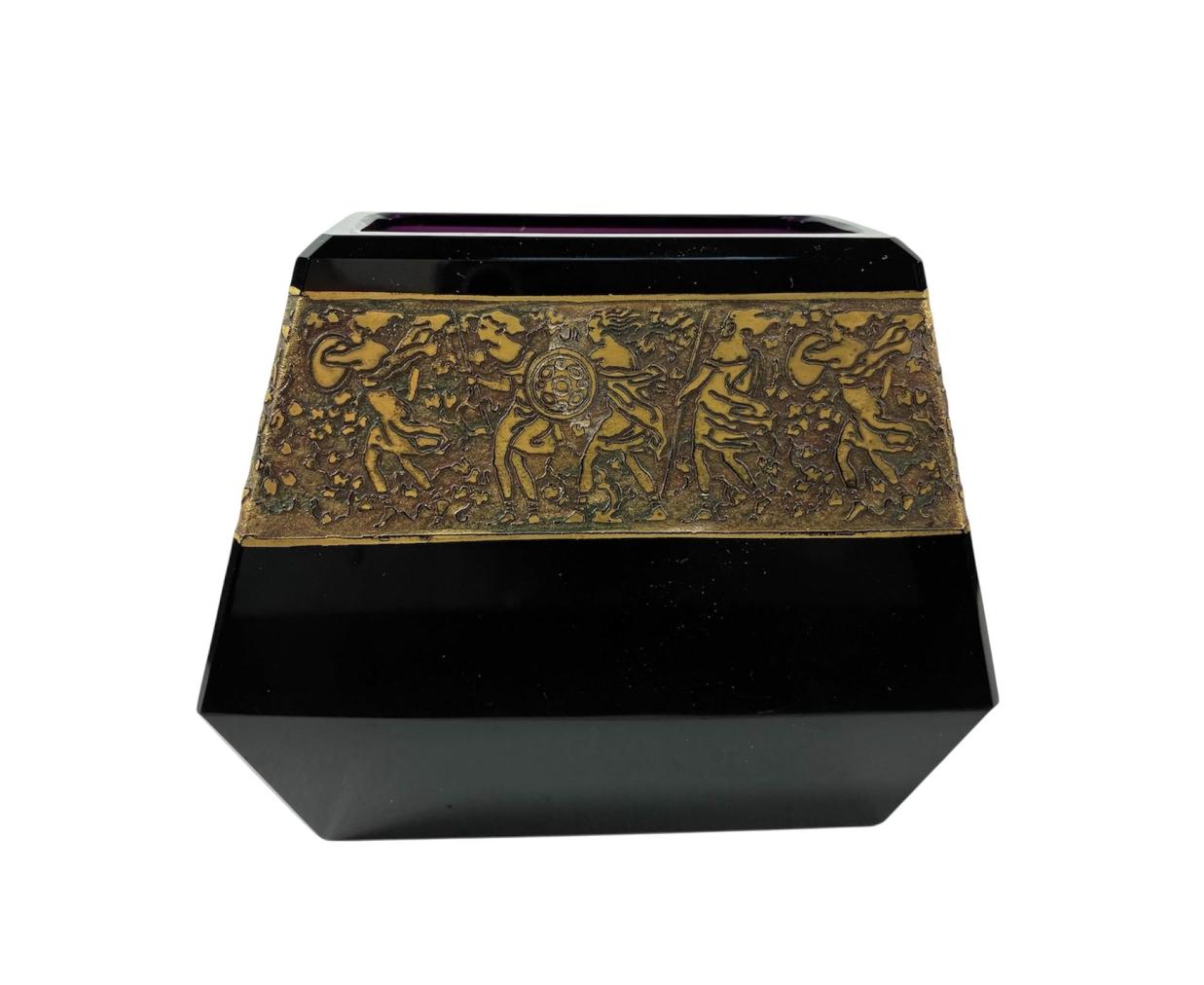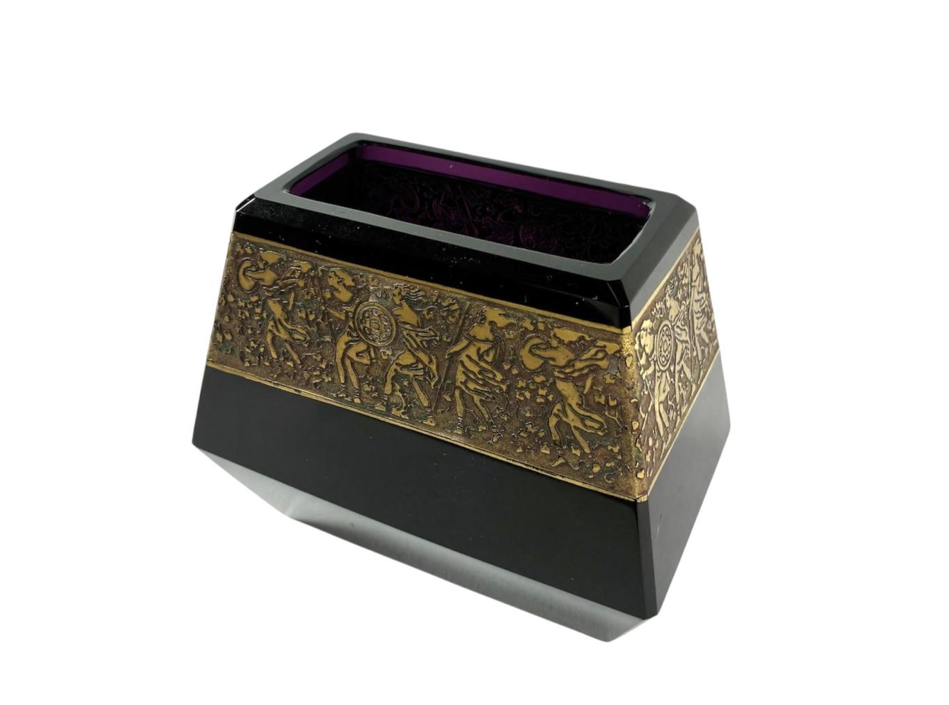 Váza hranatých tvarů v ametystovém provedení značky Moser. Po obvodu vázy se line zlacená oroplastika. Výška 9,5 cm, váza v nejširším bodě 11 x 6 cm, rozměr vrchní části 8,5 x 4,5 cm, rozměr podstavy 9 x 4 cm. Značeno vespod "Moser Karlsbad". Zlacení místy setřeno, na váze je pár mělkých škrábanců, jinak perfektní stav.