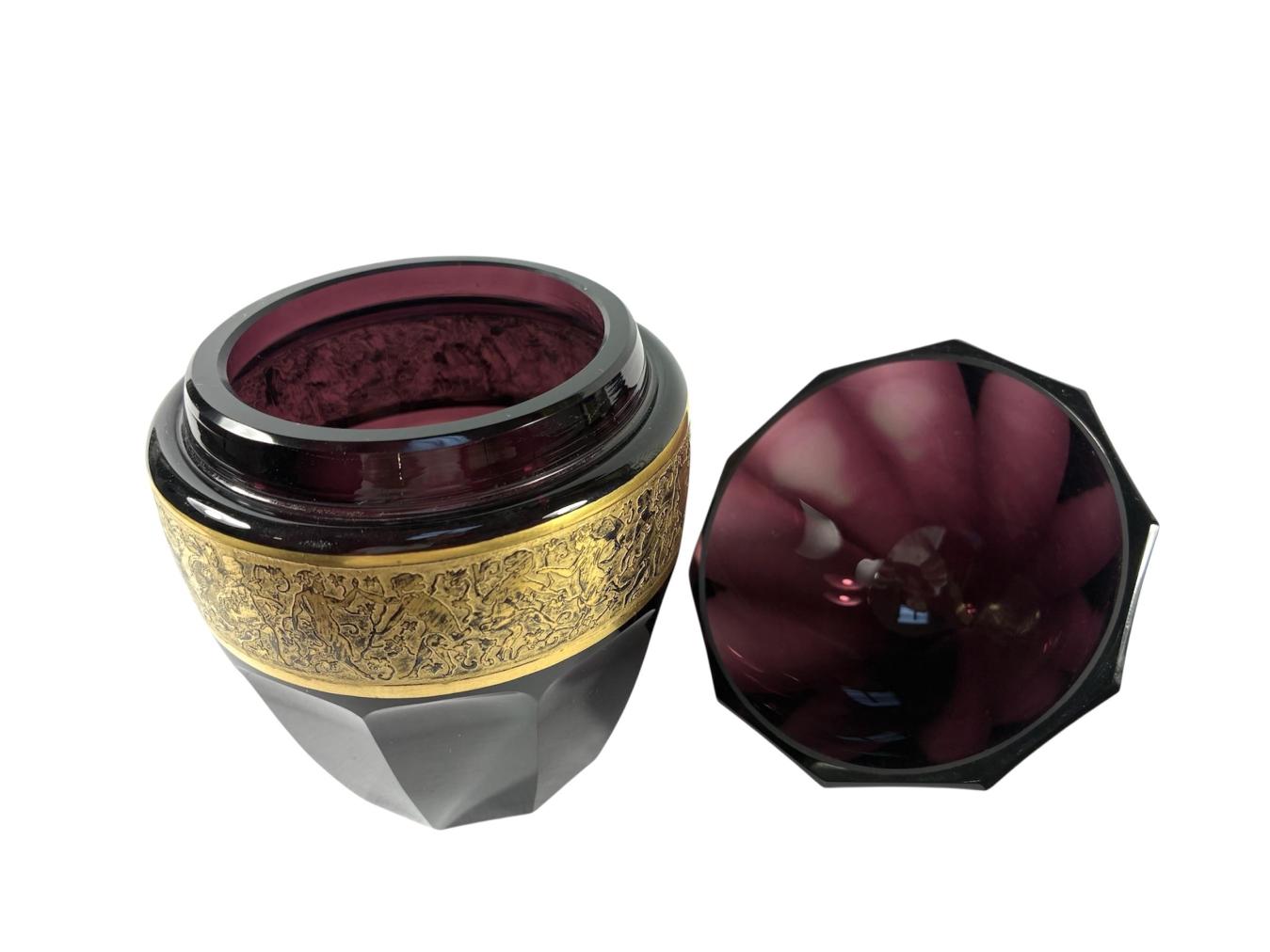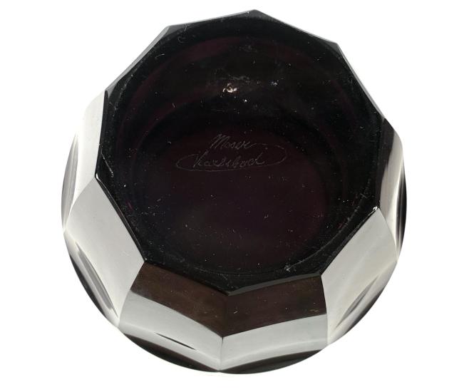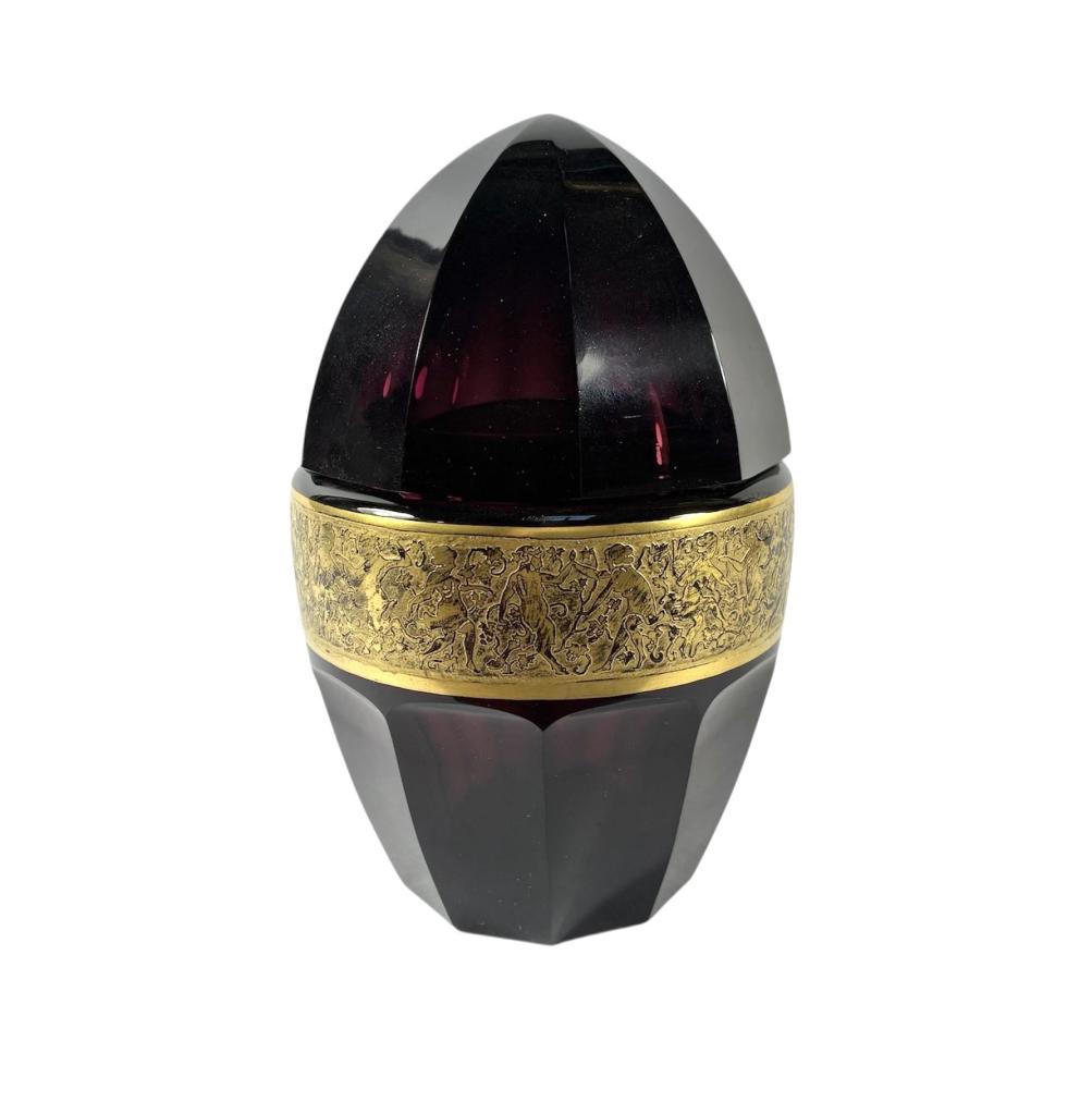 Skleněné vejce značky Moser ametystovém provedení se zlatou oroplastikou. Dóza má broušené hrany včetně víka. Výška včetně víka 15,5 cm, výška bez víka 10 cm, průměr hrdla 7,5 cm, průměr podstavy 6 cm. Pár jemných škrábanců na hraně hrdla dózy, jeden velmi drobný oťuk, jinak bez poškození. Značeno vespo "Moser Karlsbad".