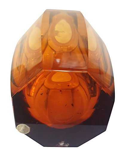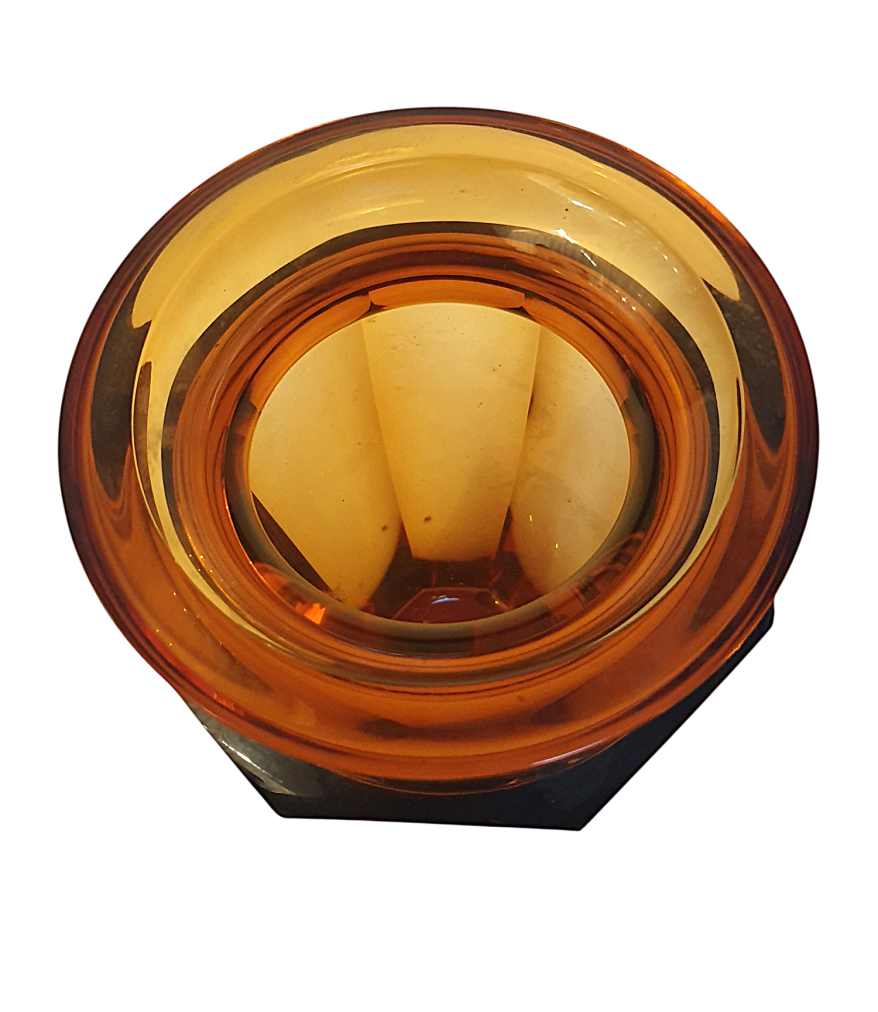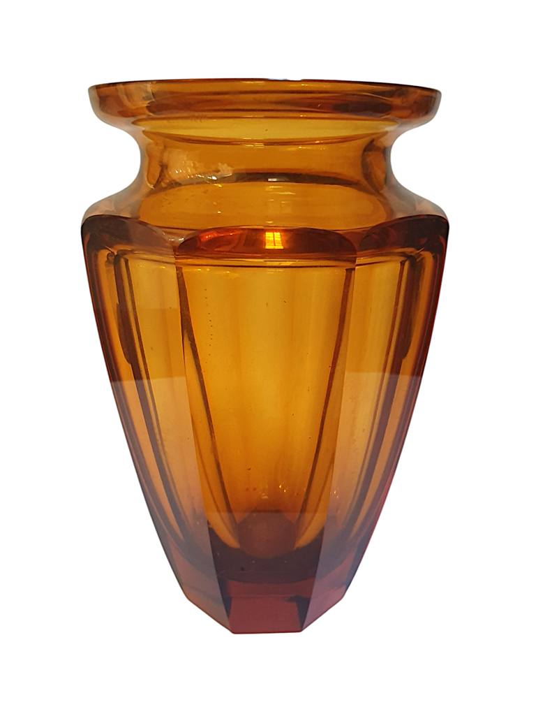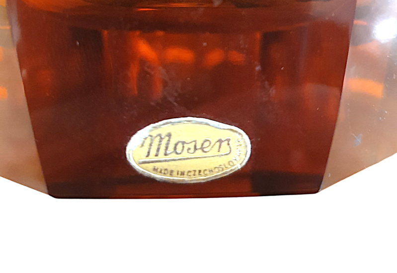Luxusní váza z ručně broušeného křišťálového skla sytě jantarové barvy. Tento nádherný kus pochází z dílen české sklárny Moser a měří na výšku 26 cm. Průměr hrdla je 15 cm a průměr podstavy 9 cm. V nejširším bodě měří 17 cm. V perfektním stavu bez poškození. Značeno zlatou nálepkou Moser a gravírovaným logem Moser ze spodní strany na podstavě. Podstava je bez škrábanců ve skvělém stavu, byla podlepena měkkými polštářky z nichž žůstal pouze jeden ks viz foto.