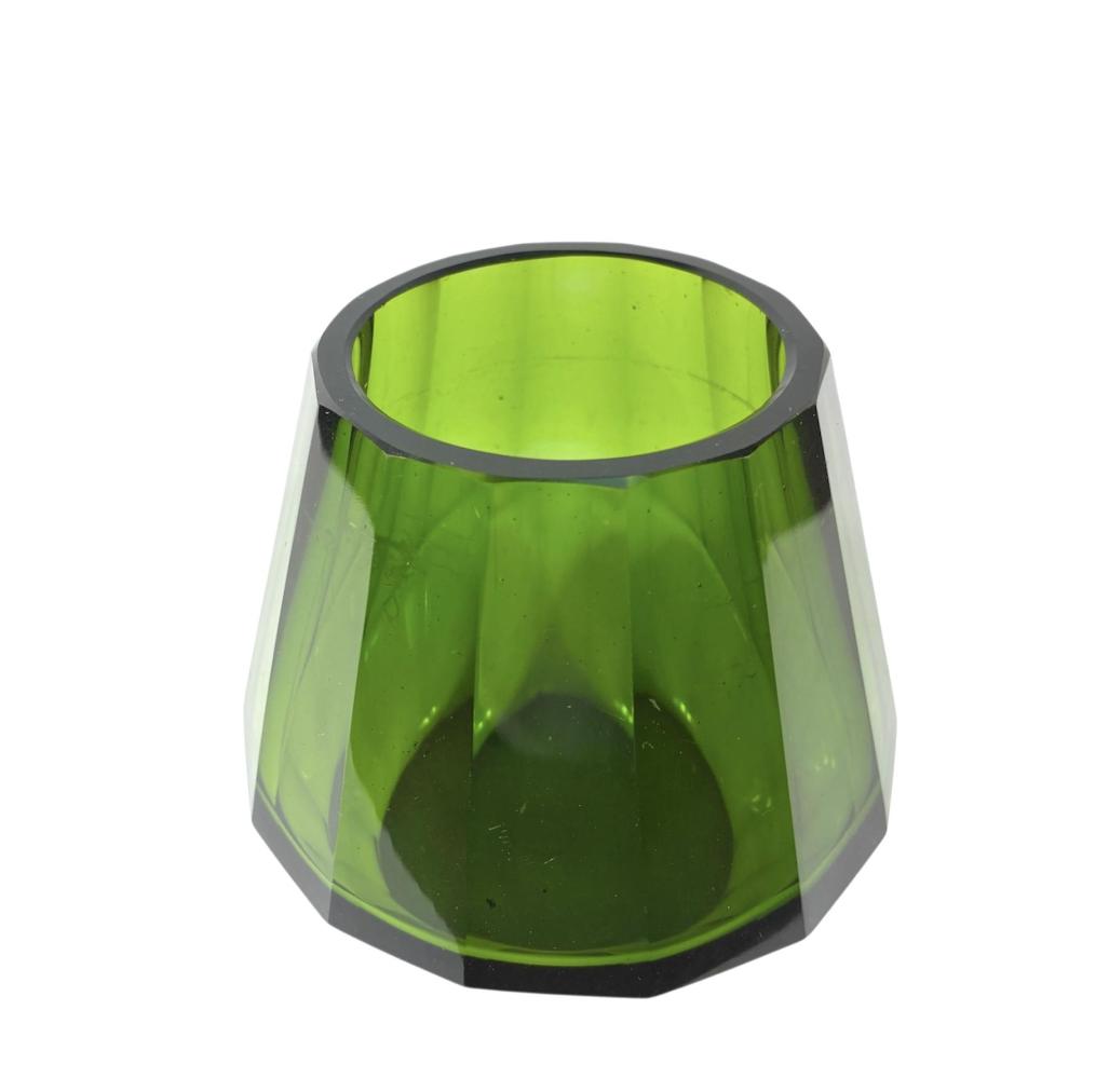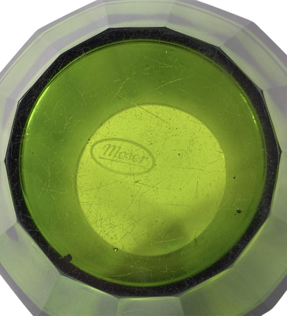 Krásná klasická váza značky Moser v zeleném odstínu. Váza má broušené hrany. Výška 11 cm, průměr vrchní části 7,5 cm, průměr podstavy 7,5 cm. Jedna hrana má jemný oťuk, na váze jsou místy mělké rýhy, poškrábaná podstava, jinak bez výrazného poškození. Značeno vespod "Moser".