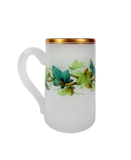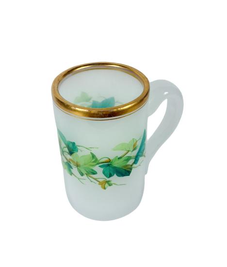 Skleněný půllitr se zlatým okrajem a ručním malováním. Výška 13,5 cm, podstava 8,5 cm, šířka v nejširším bodě 12,4 cm. Neznačeno. Oděrky na zlatém okraji.