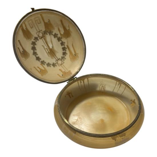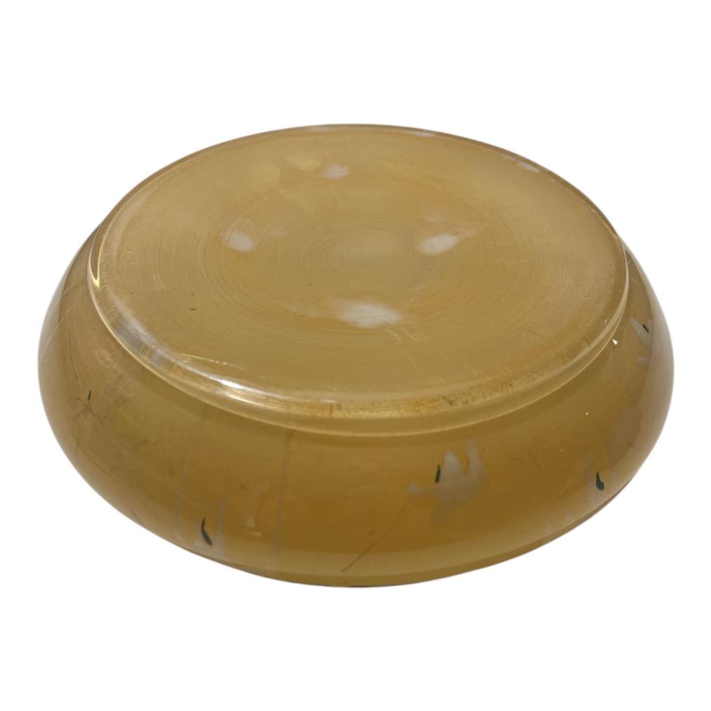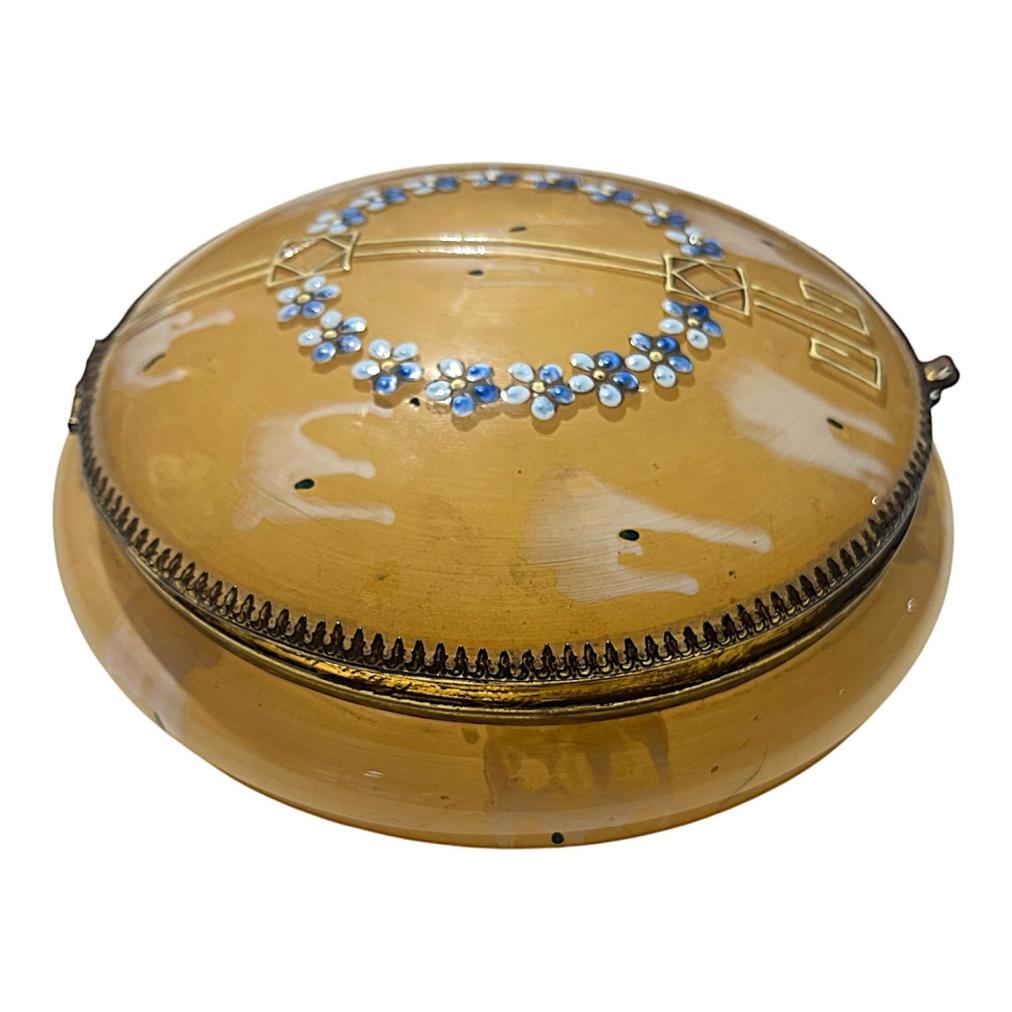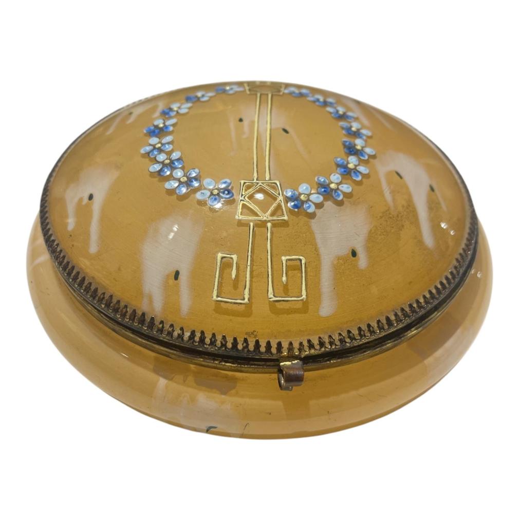 Starožitná, ručně malovaná secesní dóza ze žlutého skla, s mosaznou montáží. Na výšku měří 7 cm, průměr podstavy je 12 cm, průměr hrdla je 14 cm. Zlatá barva na kovovém lemování víka je ošoupaná, jinak je dóza v dobrém stavu, bez poškození. Neznačeno.