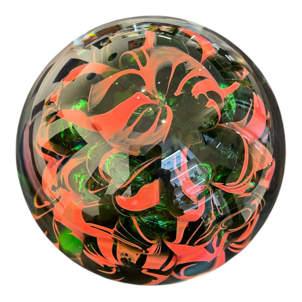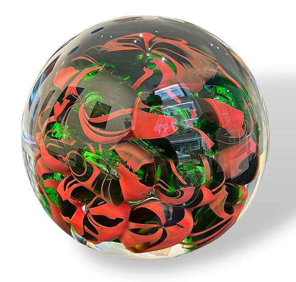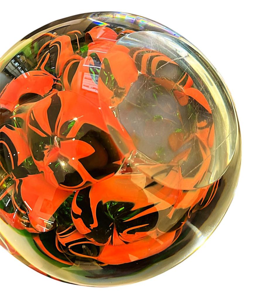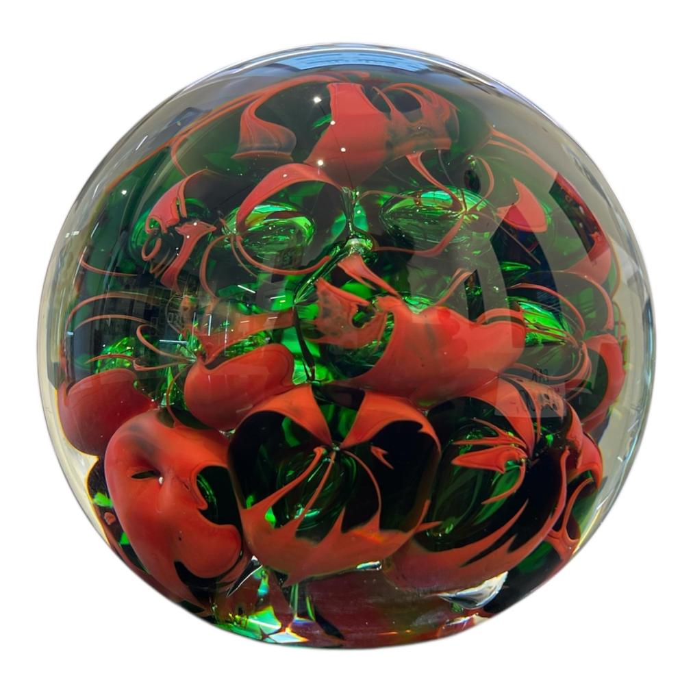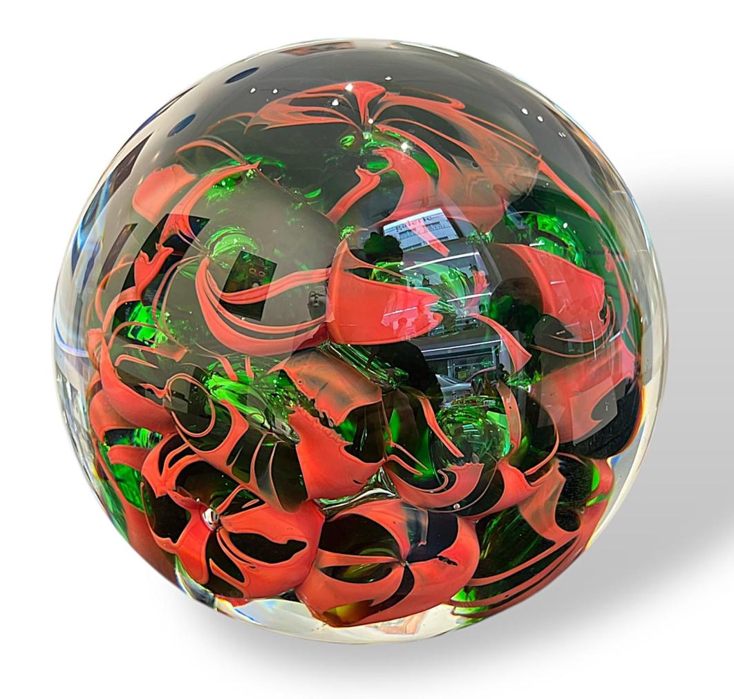 Krásné veliké těžítko se zataveným vnitřním vlněním, v sytě červených a zelených barvách, které připomíná nadýchané květy. České, ručně lité autorské sklo ve stylu Art Deco. Na výšku měří 13 cm, průměr podstavy je 7 cm. Podstava je ošoupaná s několika škrábanci, viz foto. Jinak je těžítko bez poškození. Neznačeno.